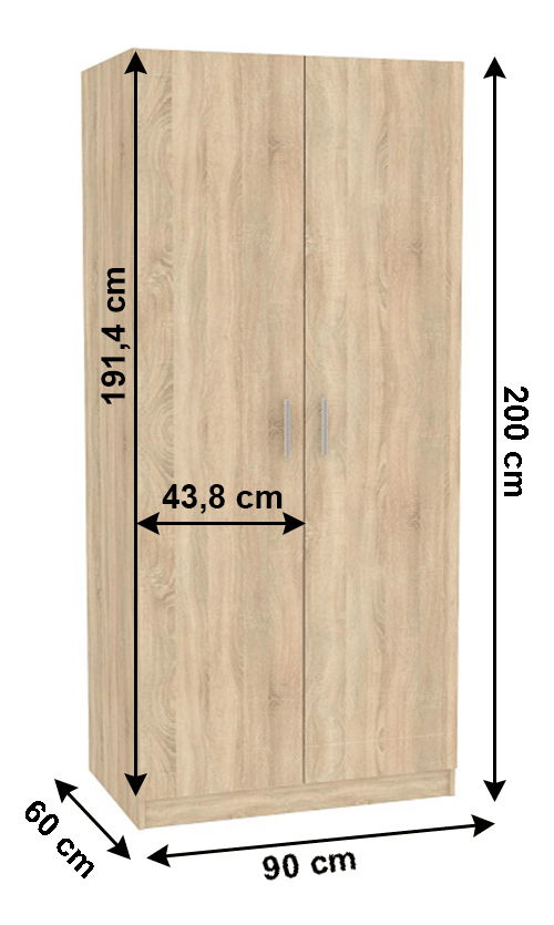Šatní skříň Izetta Typ 4 (dub sonoma) o výšce 200 cm a hloubce 60 cm je ideálním řešením pro vaše oblečení. Šatník je vyroben z kvalitní DTD laminované desky o tloušťce materiálu 16 mm. Provedení v dub sonoma barvě dodává skříni stylový a elegantní vzhled. Skříň má rozměry (ŠxHxV) 90x60x200 cm a dvoudveřové uspořádání se šířkou dvířek 43,8 cm a výškou 191,4 cm. Vhodná je pro ty, kteří mají rádi pořádek a organizaci. Skříň disponuje věšákovým systémem, který umožňuje zavěšení oblečení na ramínka. Tento kvalitní český výrobek je dodáván v demontu, což zajišťuje snadnější přepravu a skladování. Díky své kvalitě a designu bude tato šatní skříň skvělým doplňkem vašeho interiéru.