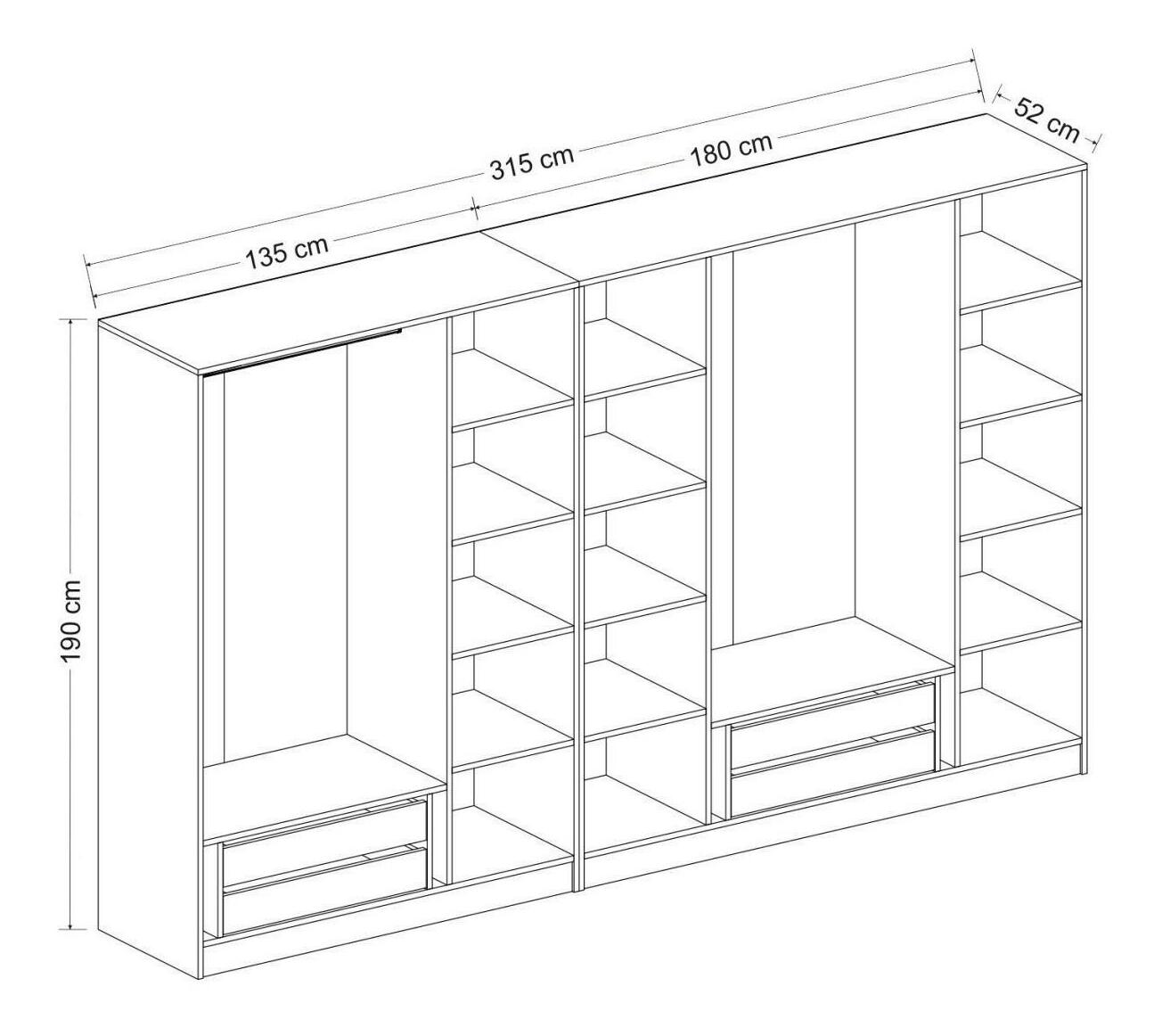 tloušťka: 18 mm, šířka: 315 cm, výška: 210 cm, hloubka: 52 cm
