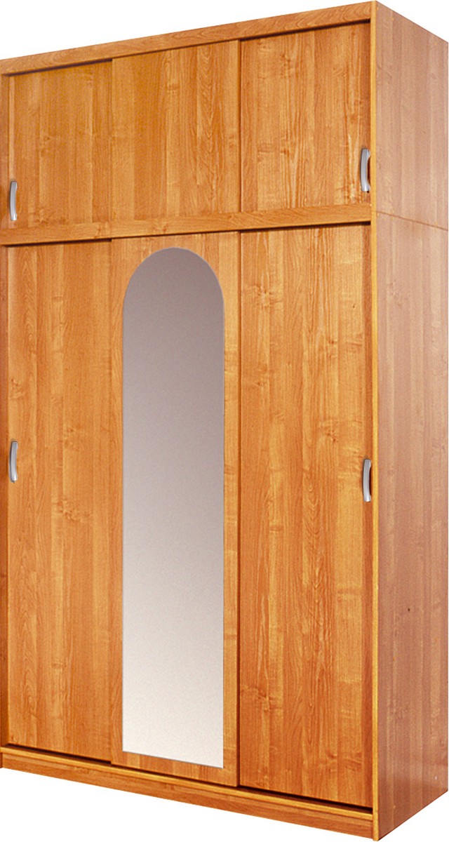 Šatní skříň s třemi posuvnými dveřmi. Uvnitř dolního dílu za pravými a středními dveřmi se nachází věšáková tyč. Za levými dveřmi se nacházejí police a 3 zásuvky na spodku. Šedé oválné úchyty, provedení olše a buk. Horní díl je vybaven jednou policí. Střední dveře na sobě nesou zrcadlo s oválnou horní stranou.