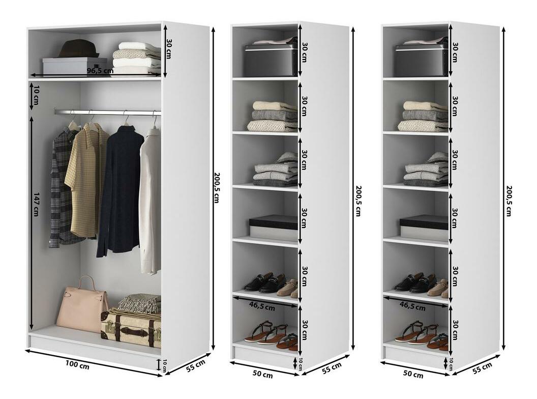 Sníte o elegantním uložení oblečení? Hledáte praktické a elegantní dotvoření vašeho šatníku? Představujeme šatní skříň – spojení stylu a praktičnosti pro váš prostor Šatní skříň je elegantním a stylovým řešením, které bude skvělou volbou i pro malé skříně. Jeho minimalistický design se perfektně hodí do moderního i klasického interiéru. Celé tělo je vyrobeno z kvalitní laminované dřevotřískové desky, která zaručuje odolnost a snadné čištění. Vnitřní prostor je navržen tak, aby se do něj vešly různé kusy oblečení a doplňků, na tyči můžete zavěsit oblečení, abyste jej udrželi v dobrém stavu, zatímco horní police vám umožní uložit méně často používané oblečení nebo doplňky efektivně třídit oblečení nebo přísady. Klasická a univerzální barva dodává místnosti eleganci a styl a dokonale ladí s různými dekorativními styly. Správně nakonfigurovaný šatník vám umožní snadno se zbavit chaosu a udržovat pořádek. V této šatní skříni je funkčnost stejně důležitá jako vzhled, proto ji můžete umístit i na viditelná místa bez obav z nepořádku v interiéru. Detail produktu: korpus vyrobený z laminované dřevotřísky tloušťky 16 mm v barvě White 110 PE Kronospan, která je odolná. vlhkosti, teplotě a poškrábání, lišta dlouhá 96,5 cm umístěná ve výšce 147 cm od základny, rozměry police: šířka 46,5/96,5 cm / výška 30 cm / hloubka 55 cm, možnost změny konfigurace uvnitř skříně při montáži etapa .