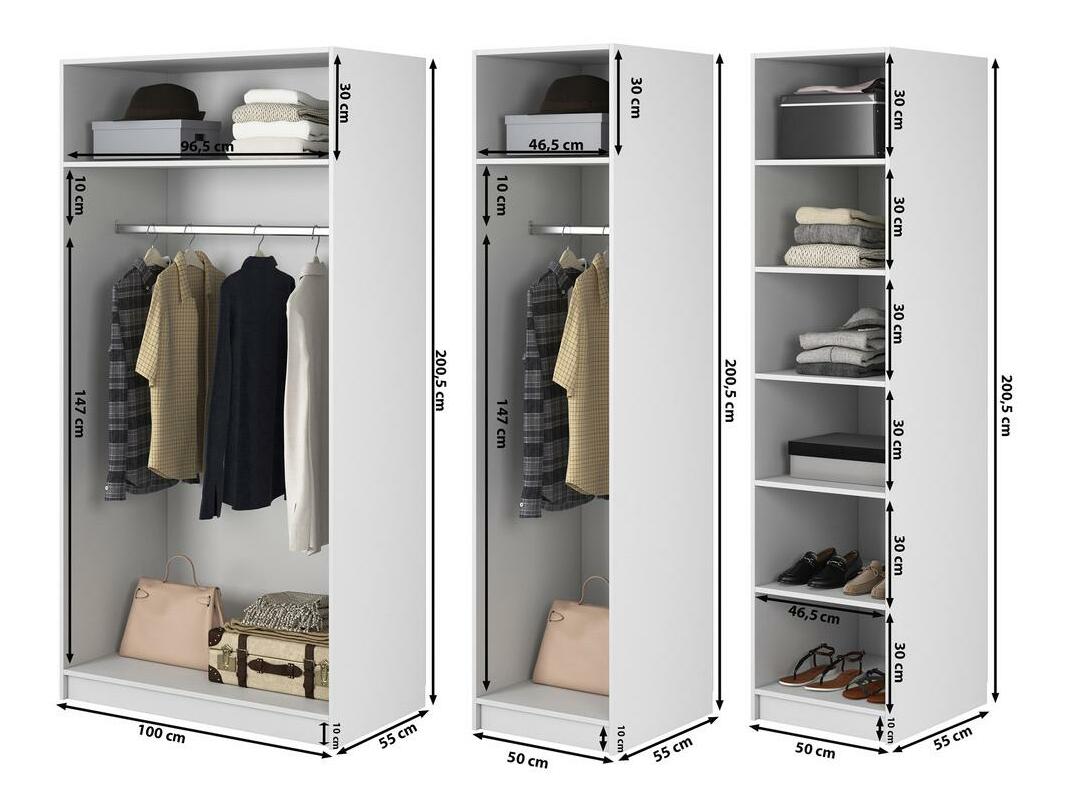 Sníte o elegantním uložení oblečení? Hledáte praktické a elegantní dotvoření vašeho šatníku? Představujeme šatní skříň – spojení stylu a praktičnosti pro váš prostor Šatní skříň je elegantním a stylovým řešením, které bude skvělou volbou i pro malé skříně. Jeho minimalistický design se perfektně hodí do moderního i klasického interiéru. Celé tělo je vyrobeno z kvalitní laminované dřevotřískové desky, která zaručuje odolnost a snadné čištění. Vnitřní prostor je navržen tak, aby se do něj vešly různé kusy oblečení a doplňků, na tyči můžete zavěsit oblečení, abyste jej udrželi v dobrém stavu, zatímco horní police vám umožní uložit méně často používané oblečení nebo doplňky efektivně třídit oblečení nebo přísady. Klasická a univerzální barva dodává místnosti eleganci a styl a dokonale ladí s různými dekorativními styly. Správně nakonfigurovaný šatník vám umožní snadno se zbavit chaosu a udržovat pořádek. V této šatní skříni je funkčnost stejně důležitá jako vzhled, proto ji můžete umístit i na viditelná místa bez obav z nepořádku v interiéru. Detail produktu: korpus vyrobený z laminované dřevotřísky tloušťky 16 mm v barvě White 110 PE Kronospan, která je odolná. vlhkosti, teplotě a poškrábání, tyč dlouhá 46,5 a 96,5 cm umístěná ve výšce 147 cm od základny, rozměry police: šířka 46,5/96,5 cm / výška 30 cm / hloubka 55 cm, možnost změny konfigurace uvnitř skříně při etapa montáže.