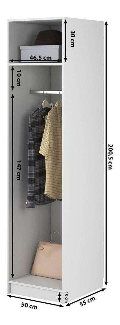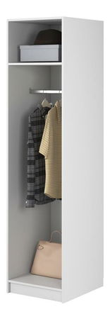 Sníte o elegantním uložení oblečení? Hledáte praktické a elegantní dotvoření vašeho šatníku? Představujeme šatní skříň – spojení stylu a praktičnosti pro váš prostor Šatní skříň je elegantním a stylovým řešením, které bude skvělou volbou i pro malé skříně. Jeho minimalistický design se perfektně hodí do moderního i klasického interiéru. Celé tělo je vyrobeno z kvalitní laminované dřevotřískové desky, která zaručuje odolnost a snadné čištění. Vnitřní prostor je navržen tak, aby se do něj vešly různé kusy oblečení a doplňků, hrazda umožňuje zavěsit oblečení, aby se udrželo v dobrém stavu, zatímco horní police umožňuje uložit méně často používané oblečení nebo doplňky eleganci a styl místnosti a dokonale ladí s různými dekorativními styly. Správně nakonfigurovaný šatník vám umožní snadno se zbavit chaosu a udržovat pořádek. V této šatní skříni je funkčnost stejně důležitá jako vzhled, proto ji můžete umístit i na viditelná místa bez obav z nepořádku v interiéru. Detail produktu: korpus vyrobený z laminované dřevotřísky tloušťky 16 mm v barvě White 110 PE Kronospan, která je odolná. proti vlhkosti, teplotě a poškrábání, tyč dlouhá 46,5 cm umístěná ve výšce 147 cm od základny, rozměry police: šířka 46,5 cm / výška 30 cm / hloubka 55 cm, možnost změny konfigurace uvnitř skříní při montáži.