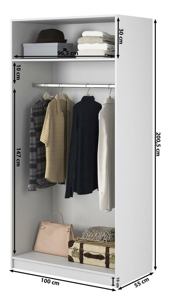 Sníte o elegantním uložení oblečení? Hledáte praktické a elegantní dotvoření vašeho šatníku? Představujeme šatní skříň – spojení stylu a praktičnosti pro váš prostor Šatní skříň je elegantním a stylovým řešením, které bude skvělou volbou i pro malé skříně. Jeho minimalistický design se perfektně hodí do moderního i klasického interiéru. Celé tělo je vyrobeno z kvalitní laminované dřevotřískové desky, která zaručuje odolnost a snadné čištění. Vnitřní prostor je navržen tak, aby se do něj vešly různé kusy oblečení a doplňků, kolejnice umožňuje zavěsit oblečení, aby se udrželo v dobrém stavu, zatímco horní police umožňuje odložit méně často používané oblečení nebo doplňky. Klasická a univerzální barva dodává místnosti eleganci a styl a dokonale ladí s různými dekorativními styly. Správně nakonfigurovaný šatník vám umožní snadno se zbavit chaosu a udržovat pořádek. V této šatní skříni je funkčnost stejně důležitá jako vzhled, proto ji můžete umístit i na viditelná místa bez obav z nepořádku v interiéru. Detail produktu: korpus vyrobený z laminované dřevotřísky tloušťky 16 mm v barvě White 110 PE Kronospan, která je odolná. vlhkosti, teplotě a poškrábání, tyč dlouhá 96,5 cm umístěná ve výšce 147 cm od základny, rozměry police: šířka 96,5 cm / výška 30 cm / hloubka 55 cm, možnost změny konfigurace uvnitř skříní při montáži.