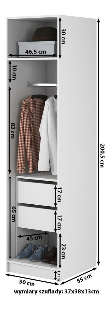 Sníte o elegantním uložení oblečení? Hledáte praktické a elegantní dotvoření vašeho šatníku? Představujeme šatní skříň – spojení stylu a praktičnosti pro váš prostor Šatní skříň je elegantním a stylovým řešením, které bude skvělou volbou i pro malé skříně. Jeho minimalistický design se perfektně hodí do moderního i klasického interiéru. Celé tělo je vyrobeno z kvalitní laminované dřevotřískové desky, která zaručuje odolnost a snadné čištění. Vnitřní prostor je navržen tak, aby se do něj vešly různé kusy oblečení a doplňků, na tyč můžete zavěsit oblečení, abyste jej udrželi v dobrém stavu, zatímco horní police vám umožní uložit méně často používané oblečení nebo doplňky prostor pro uložení drobných doplňků či spodní prádla, což umožňuje větší pořádek v šatníku Klasická a univerzální barva dodává místnosti eleganci a styl a dokonale ladí s různými dekorativními styly. Správně nakonfigurovaný šatník vám umožní snadno se zbavit chaosu a udržovat pořádek. V této šatní skříni je funkčnost stejně důležitá jako vzhled, proto ji můžete umístit i na viditelná místa bez obav z nepořádku v interiéru. Detail produktu: korpus vyrobený z laminované dřevotřísky tloušťky 16 mm v barvě White 110 PE Kronospan, která je odolná. vlhkosti, teplotě a poškrábání, 46,5 cm dlouhá lišta umístěná ve výšce 147 cm od základny, rozměry police: šířka 46,5 cm / výška 30 cm / hloubka 55 cm, zásuvky uložené na kulových vodítkách zajišťujících volné a plynulé vysouvání, rozměry zásuvky : šířka 37 cm / výška 13 cm / hloubka 38 cm, možnost změny konfigurace uvnitř skříně ve stádiu montáže.