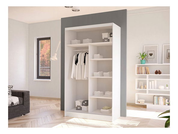 Šatní skříň vybavená tyčí a prostornými policemi.