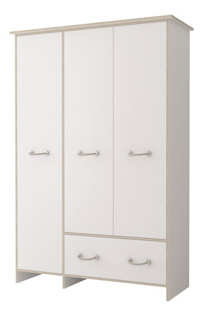Šatní skříň - Klaudia 19 (bílá + dub sonoma) s výškou 200 cm, šířkou 133 cm a hloubkou 50 cm. Tato skříň v minimalistickém a námořnickém stylu je součástí série Klaudia. Je vyrobena z 16 mm silné kvalitní laminované desky s odolnými ABS hranami. Její námořnický vzhled je zdůrazněn úchyty z lana. Skříň je navržena bez nožiček, s prodlouženými bočními stěnami pro extra stabilitu. Obsahuje tři dveře, pět polic a jednu zásuvku, což poskytuje dostatek úložného prostoru. Věšáková tyč umožňuje praktické zavěšení oděvů.