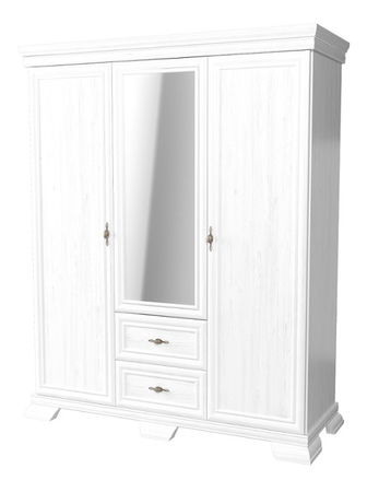 Prostorná věšáková skříň Kora s policemi rustikálního stylu. Po krajích jsou dveře, ve střední části jsou dvířka se zrcadlovou částí a dvě zásuvky. Skříň má ozdobné vyřezávané nožičky, lišty a kovové úchyty na dvířkách a zásuvkách. Bude elegantním a unikátním skvostem ve vašich ložnicích. Dodáváme ji v barevném pevedení sosna andersen.