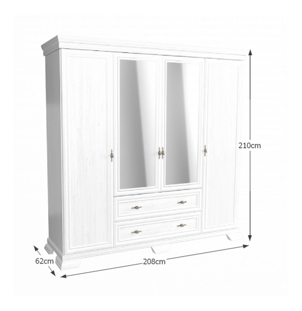Šatní skříň Kraz KS3 (sosna andersen) výšky 210 cm a hloubky 62 cm je velká rustikální skříň se čtyřmi dveřmi a zrcadlem uprostřed. Tento elegantní kousek nábytku bude jistě dominantou vaší ložnice. Skříň je vyrobena z laminované DTD a laminované MDF v barevném provedení sosna andersen. Nábytek Kraz se vyznačuje masivním vzhledem, elegantním tmavým provedením Samoa king, ozdobnými lištami, kovovými úchyty a širokým spektrem skříní, skříněk, stolků a jiných prvků. Rozměry skříně jsou 208x62x210 cm, tloušťka materiálu korpusu je 15 mm, tloušťka materiálu vrchní a dolní desky je 22 mm a výška spodního prostoru od podlahy je 10,5 cm. Skříň Kraz KS3 je ideální volba pro ty, kteří preferují rustikální styl a tradičnější vzhled nábytku.