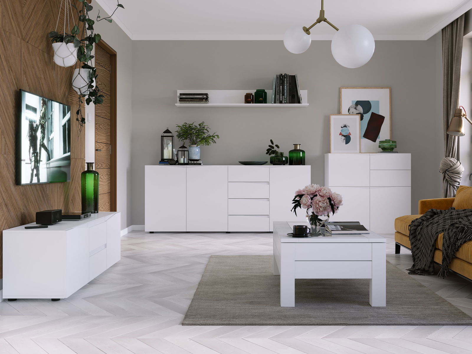 Moderní minimalistický nábytek v univerzální bílé barvě, s nímž můžete zařídit několik místností. Hodí se do předsíně, obývacího pokoje či jídelny. Funkční zásuvky Vám pomohou udržet pořádek a světlé barevné provedení rozzáří interiér, který stačí doplnit oblíbenými doplňky.