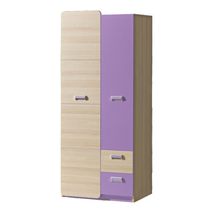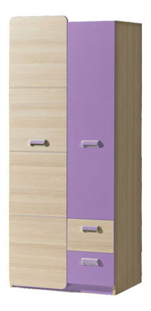 Šatní skříň pěkného moderního designu vhodná zejména do studentských a dětských pokojů. V levé části skříně se nacházejí poličky a ve spodní části dvě zásuvky. V pravé části je věšáková tyč na zavěšení oblečení a doplňků. Dvířka a zásuvky mají podlouhlé úchyty. Barevné části frontů pěkně oživí celou místnost.