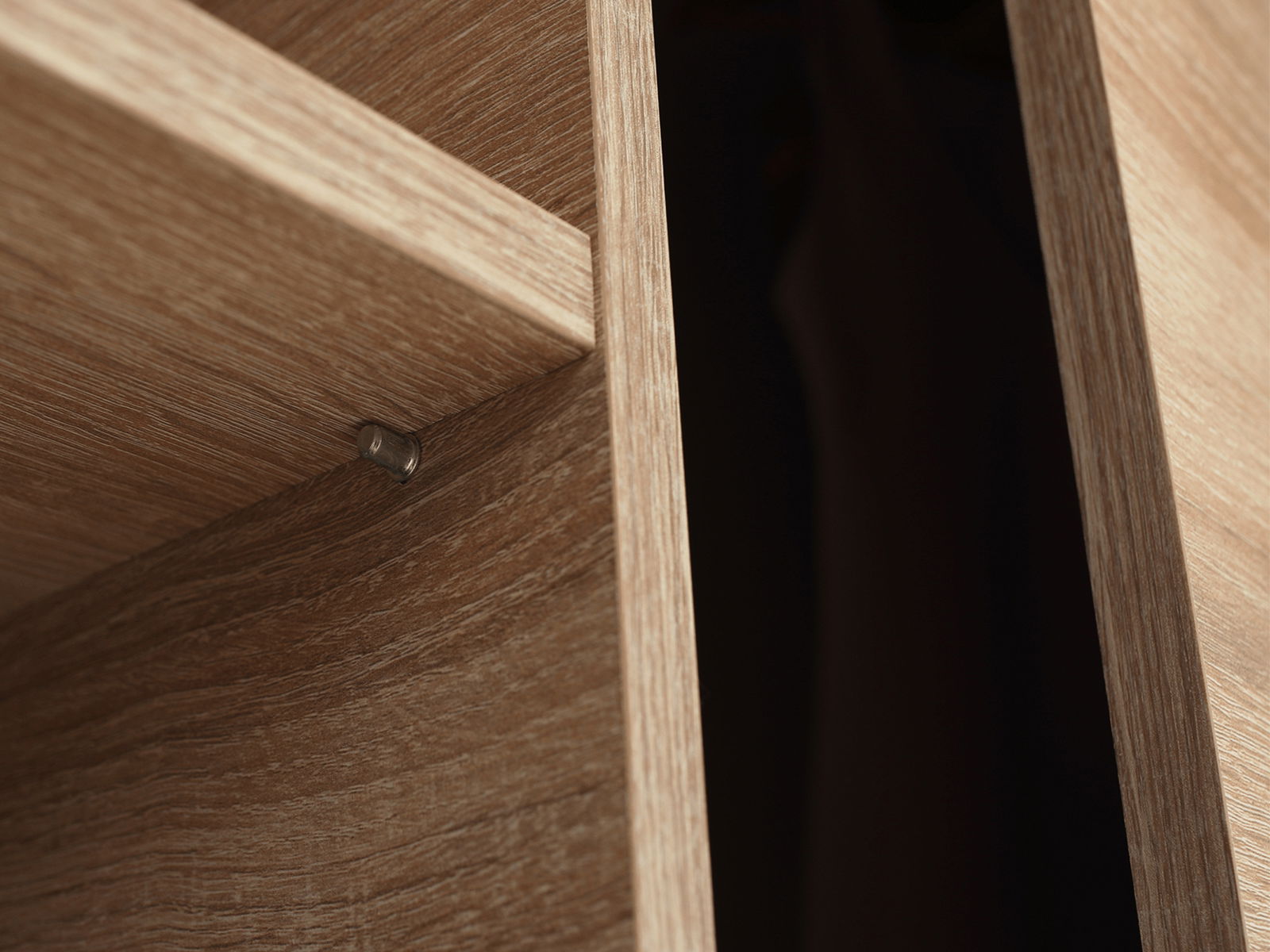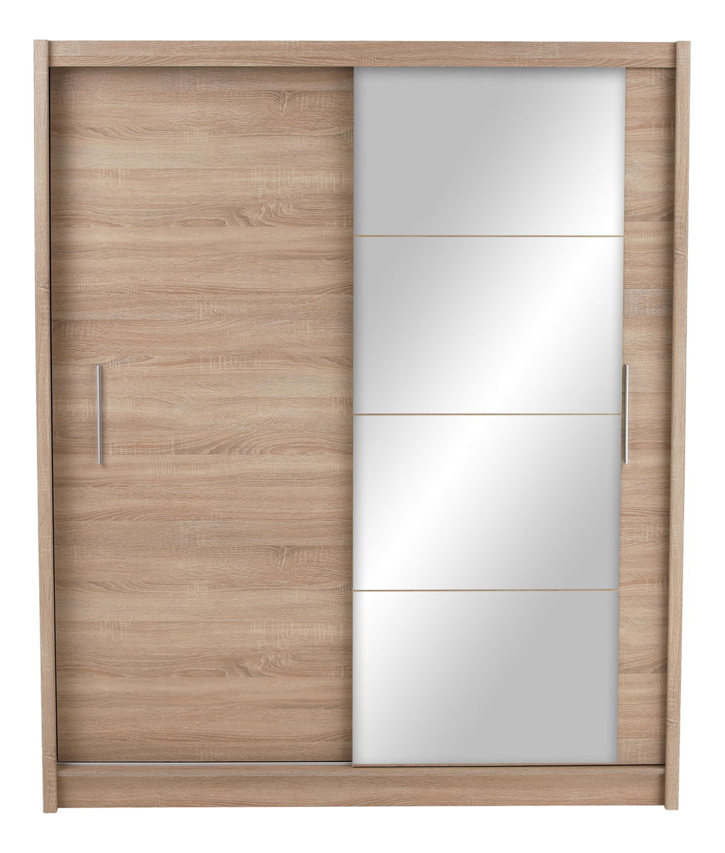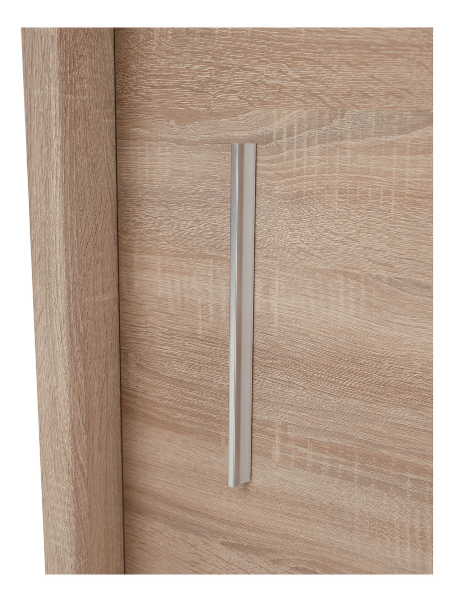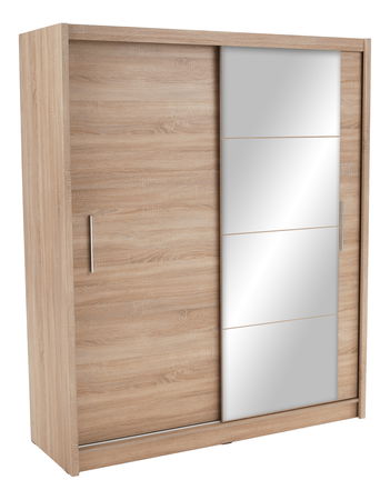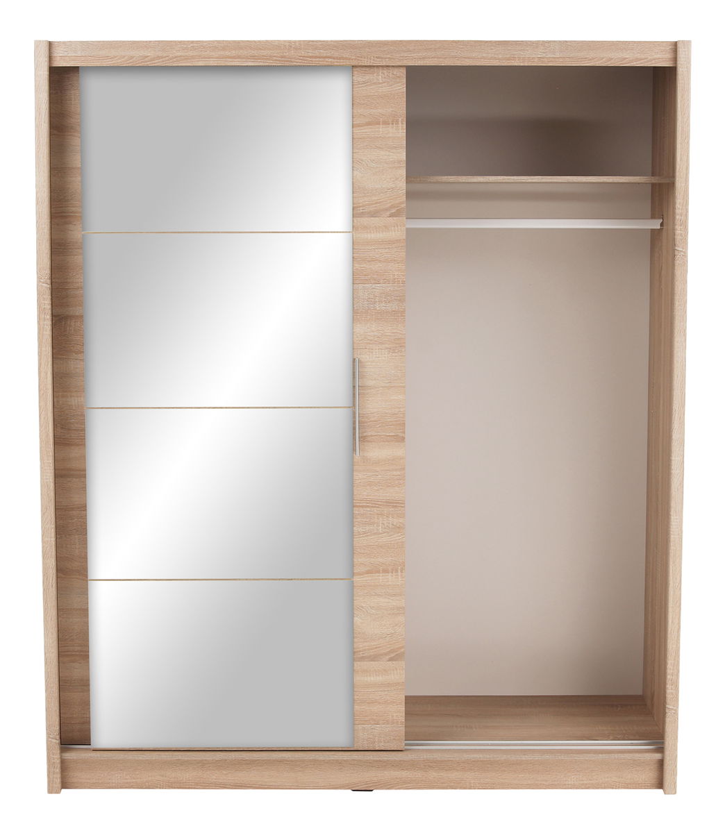 Šatní skříň Layla (dub sonoma) o výšce 215 cm, šířce 180 cm a hloubce 61 cm je moderní věšáková skříň, která se hodí do jakéhokoli prostoru a stane se dominantou vašeho pokoje. Díky posuvným dveřím nezabírá při otevírání žádný prostor, což je velkou výhodou zejména v malých pokojích. Ve skříni se nacházejí police, poskytující dostatek místa pro vaše oblečení a věšáková tyč. Skříň je vyrobena z kvalitní bílé laminované dřevotřísky a jejím bonusem je velké zrcadlo, které dodává nádech luxusu. Skříň s posuvnými dveřmi Low opticky zvětšuje prostor a stává se elegantním a designovým prvkem každé místnosti, do které ji umístíte.