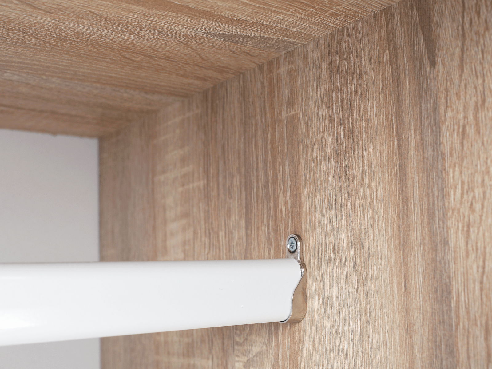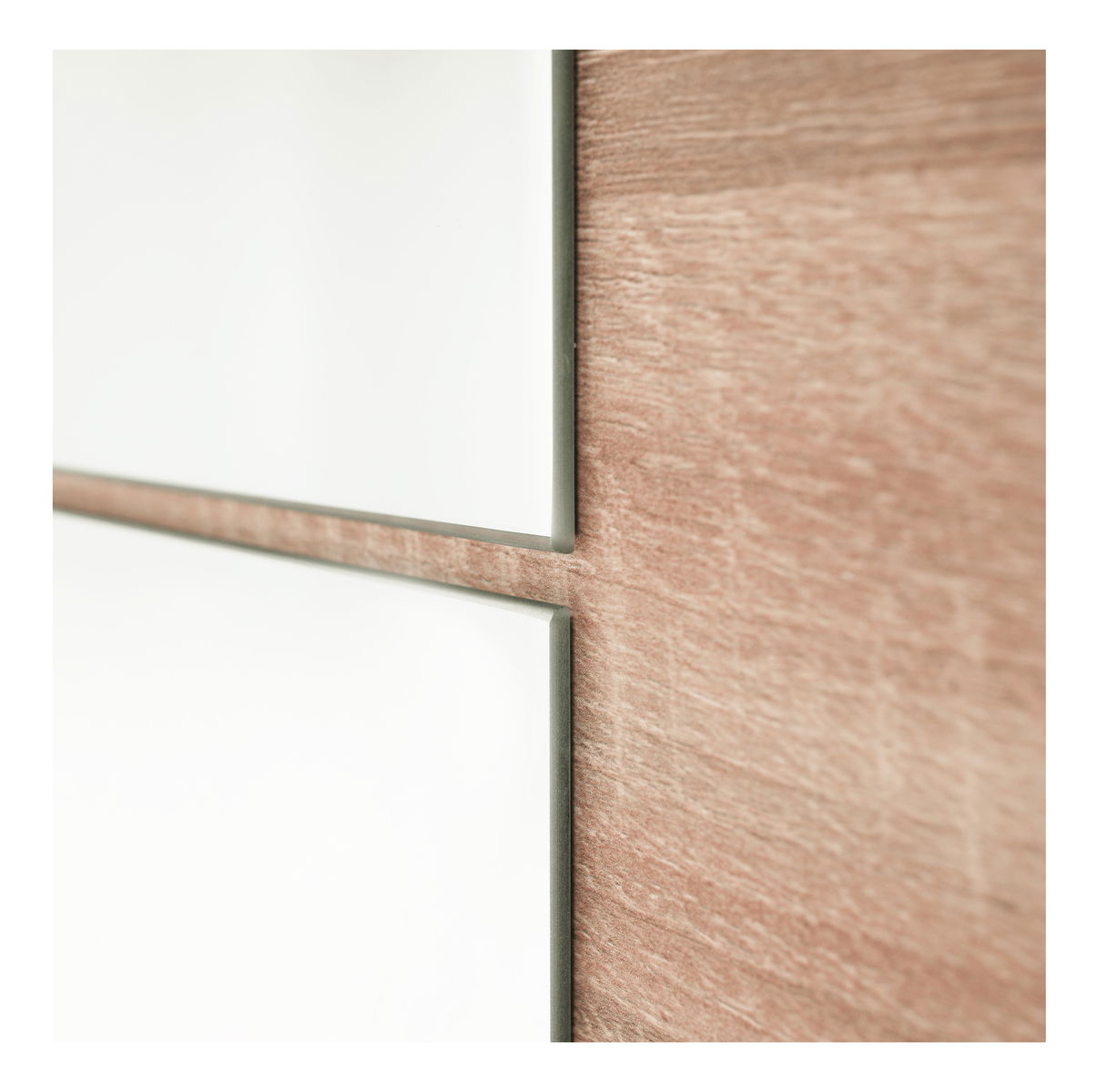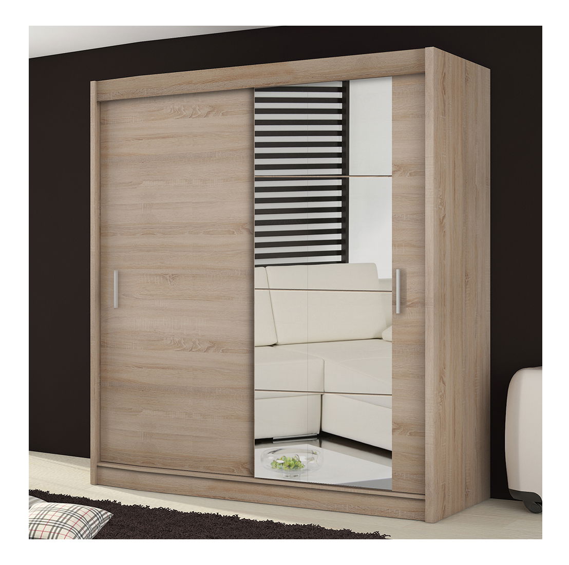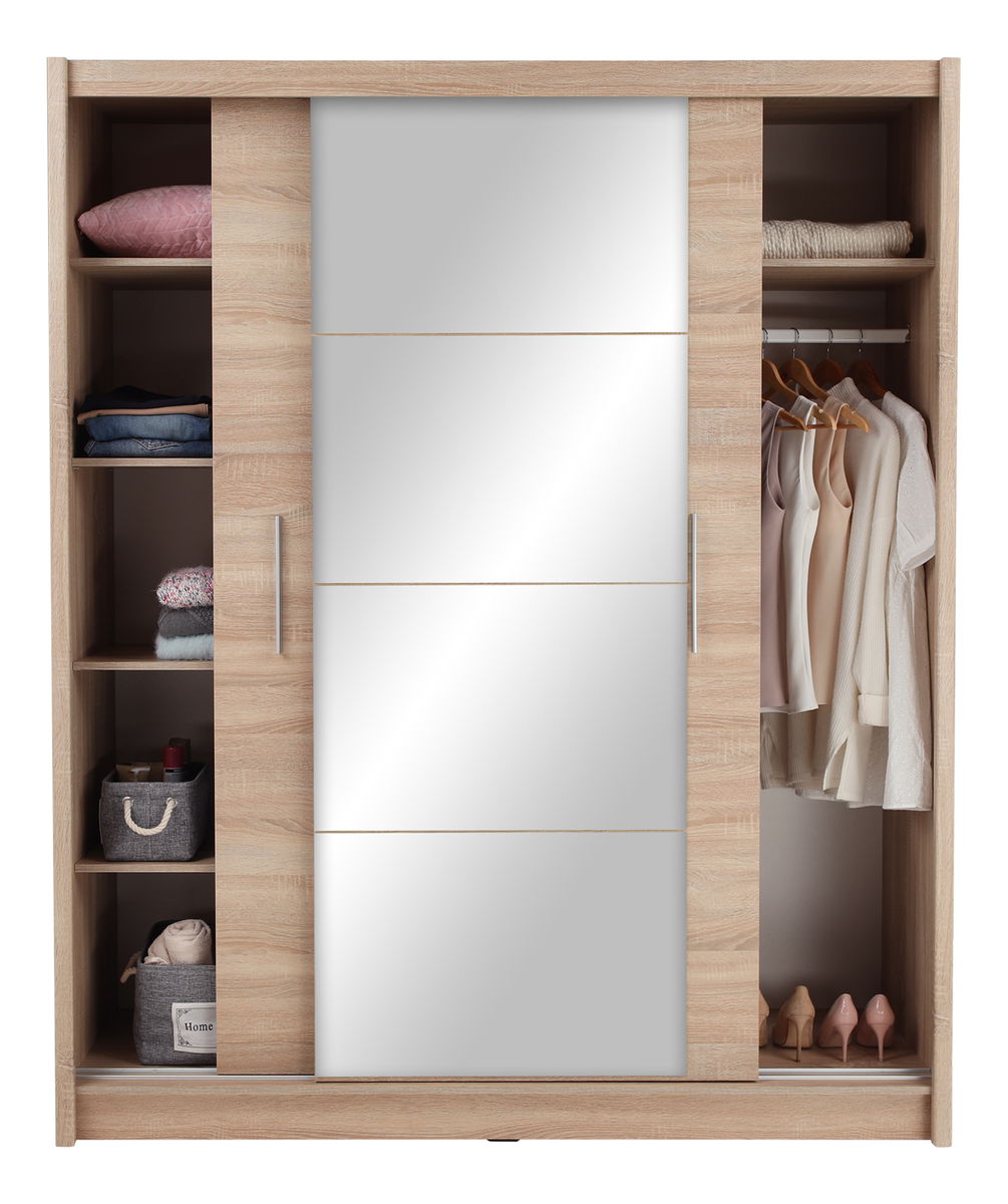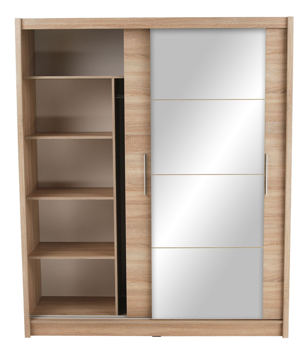 Šatní skříň Layla (dub sonoma) o výšce 215 cm, šířce 180 cm a hloubce 61 cm je moderní věšáková skříň, která se hodí do jakéhokoli prostoru a stane se dominantou vašeho pokoje. Díky posuvným dveřím nezabírá při otevírání žádný prostor, což je velkou výhodou zejména v malých pokojích. Ve skříni se nacházejí police, poskytující dostatek místa pro vaše oblečení a věšáková tyč. Skříň je vyrobena z kvalitní bílé laminované dřevotřísky a jejím bonusem je velké zrcadlo, které dodává nádech luxusu. Skříň s posuvnými dveřmi Low opticky zvětšuje prostor a stává se elegantním a designovým prvkem každé místnosti, do které ji umístíte.