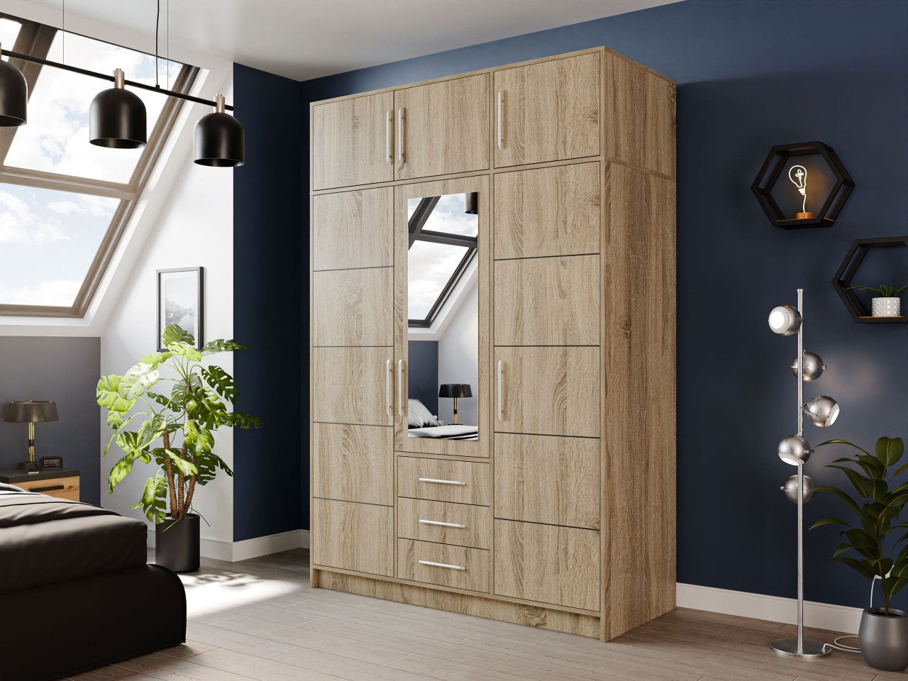 ZobrazitOceňujete spojení stylu s funkčností? Šatní skříň Lenona D3 se zrcadlem je pro vás ideální volbou! Jedná se o jedinečný model, který se vyznačuje nadčasovým designem a praktickými řešeními. Zapadne do každého interiéru a dodá mu moderní vzhled. Zrcadlo umístěné na přední straně nábytku opticky zvětší prostor a dodá jas. Navíc jej můžete využít ke zdokonalování se a výběr toho správného outfitu do práce, školy nebo ven s vašimi blízkými. Třídveřová šatní skříň má bohatý vnitřek, se kterým si dokonale uspořádáte oblečení a doplňky. Uvnitř naleznete prostorné úložné prostory, prostorné zásuvky a tyč na šaty, která je jako stvořená pro uložení šatů, košil a bund.