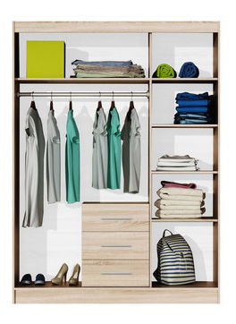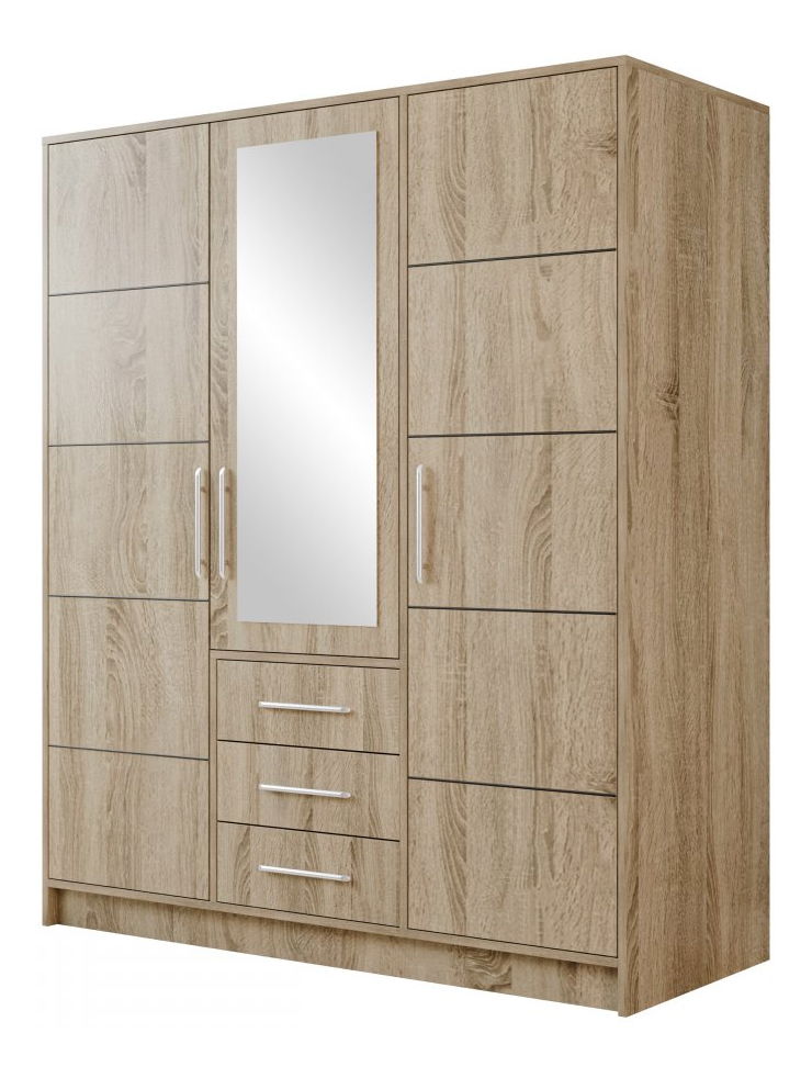 ZobrazitOceňujete spojení stylu s funkčností? Šatní skříň Lenona D3 se zrcadlem je pro vás ideální volbou! Jedná se o jedinečný model, který se vyznačuje nadčasovým designem a praktickými řešeními. Zapadne do každého interiéru a dodá mu moderní vzhled. Zrcadlo umístěné na přední straně nábytku opticky zvětší prostor a dodá jas. Navíc jej můžete využít ke zdokonalování se a výběr toho správného outfitu do práce, školy nebo ven s vašimi blízkými. Třídveřová šatní skříň má bohatý vnitřek, se kterým si dokonale uspořádáte oblečení a doplňky. Uvnitř naleznete prostorné úložné prostory, prostorné zásuvky a tyč na šaty, která je jako stvořená pro uložení šatů, košil a bund.