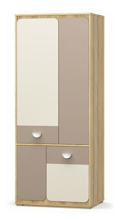 Šatní skříň příjemného moderního designu vhodná do dětského nebo studentského pokoje. Poslouží pro uložení oblečení a různých doplňků. Dvířka skříně mají půlkruhové úchyty. Barevné provedení skříně je dub ječný, champagne, cappuccino.