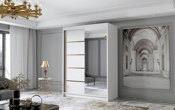 Šatní skříň ocení ti, kteří si nepotrpí na design, ale hledají především praktičnost nábytku. Skříň má praktické posuvné dveře a ukrývá v sobě dostatečné množství úložného prostoru, ať už pro vaše oblečení, povlečení nebo doplňky. V levé části se nachází věšáková tyč a v pravé části se nacházejí police. V horní části se nachází další úložný prostor. Skříň je v pěkném bílém provedení.