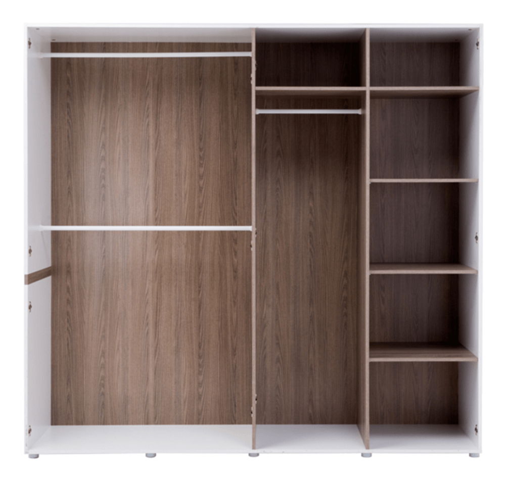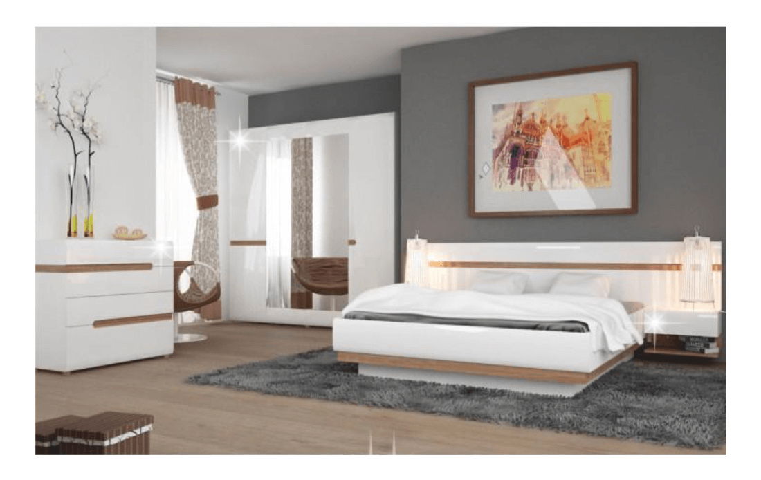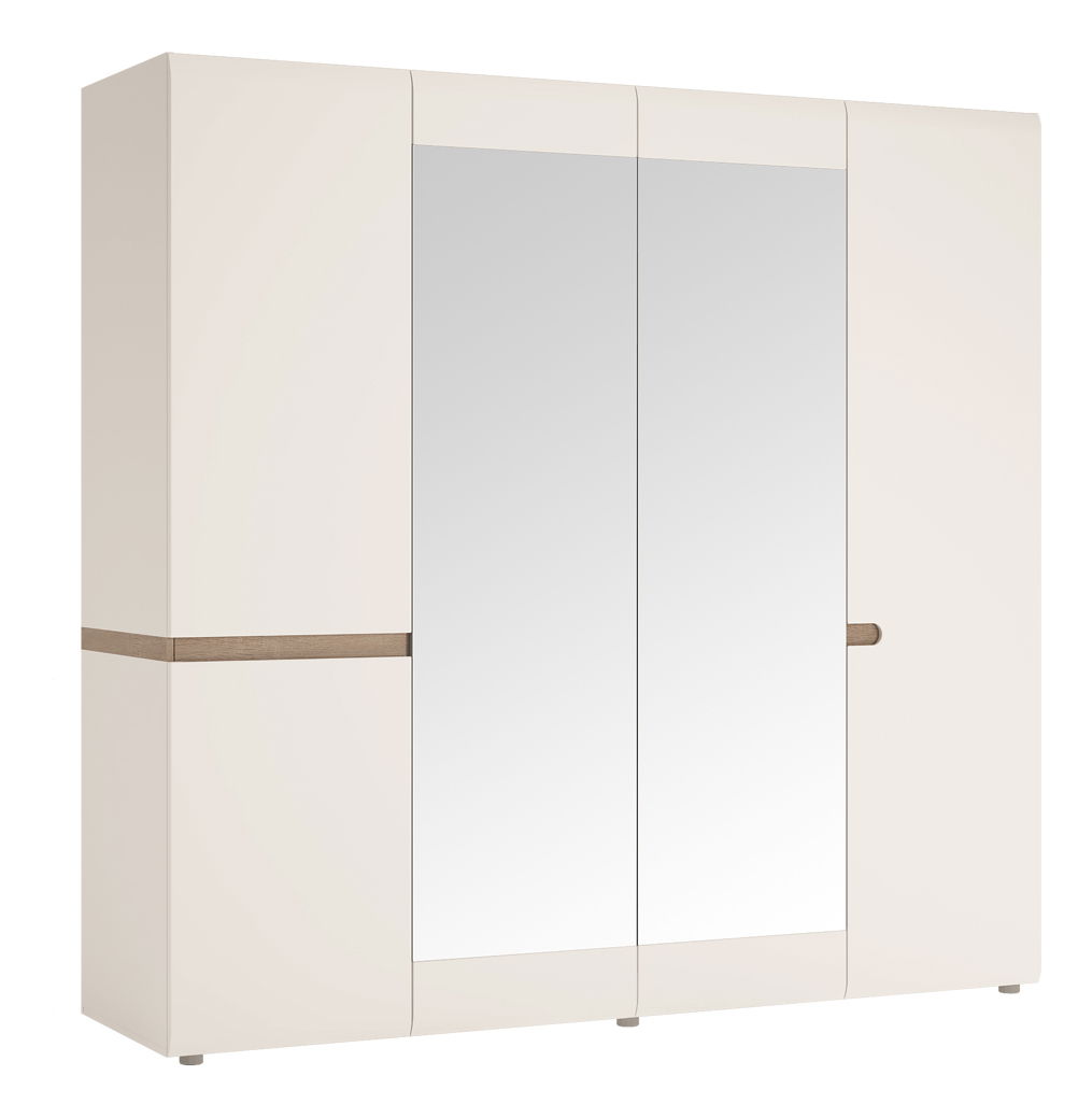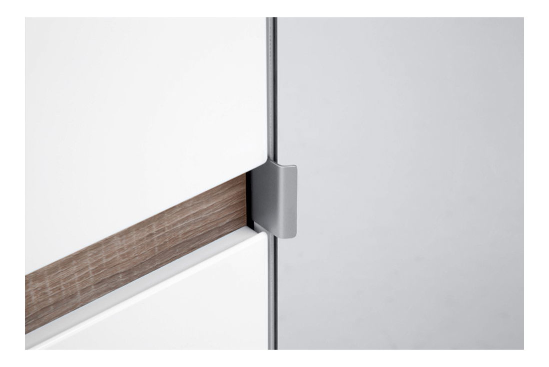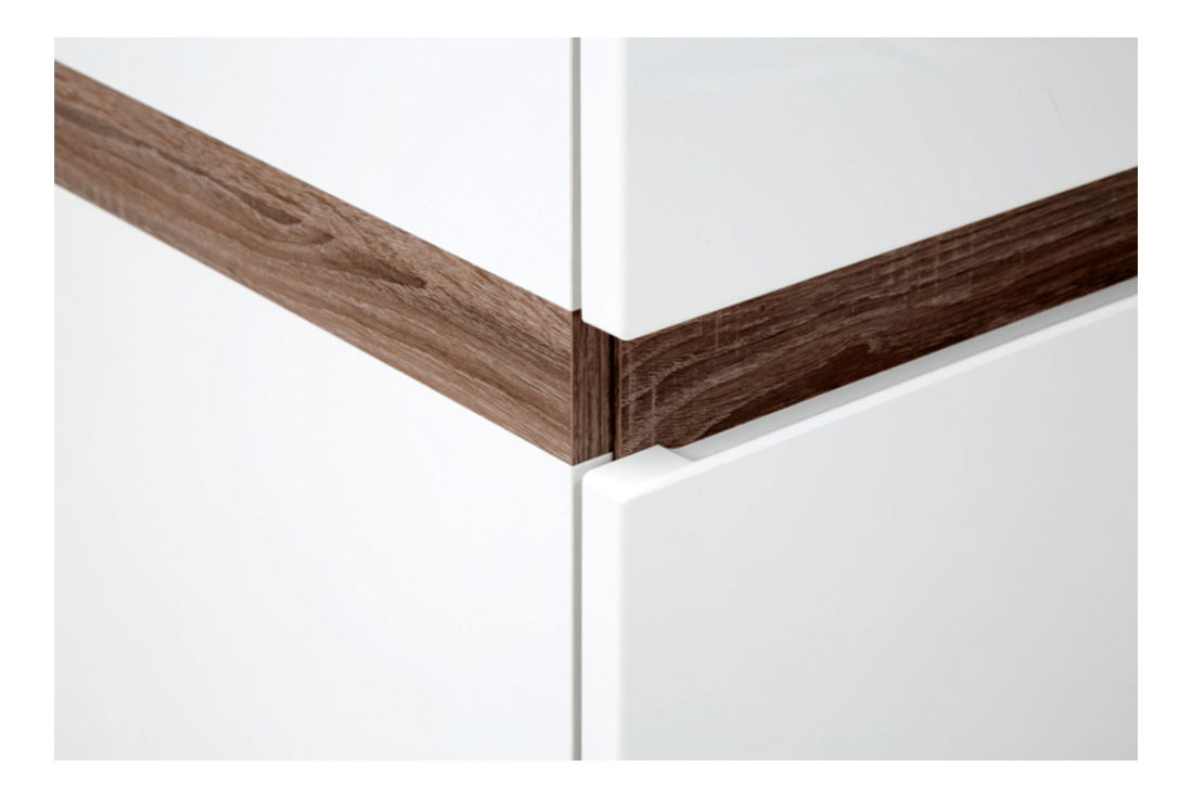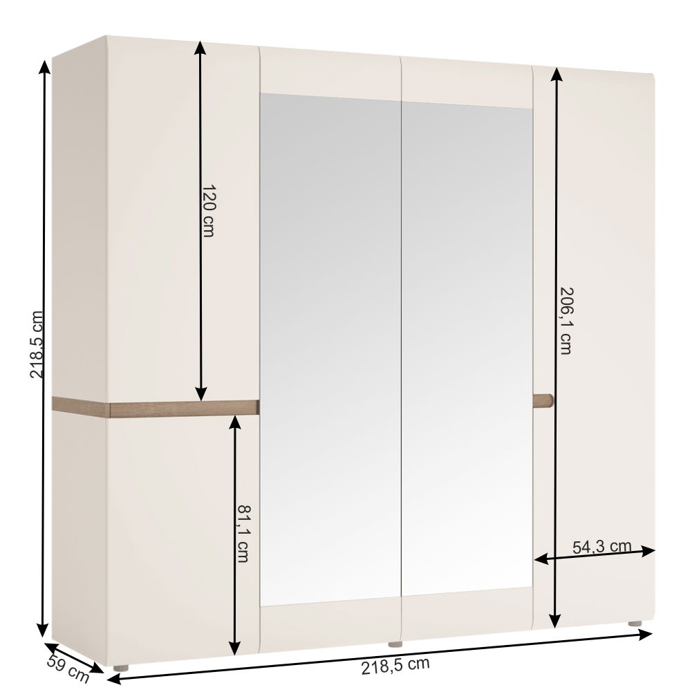 Rozměrná šatní skříň rady Lynatet typ 23 je navržena se 4 dveřmi. Střední dvoje dveře má zevně na sobě zrcátko a vnější dveře jsou v odstínu bílé v kombinaci s designovými prvky v odstínu dub sonoma truflový. Uvnitř se v levé polovině nacházejí 2 věšákové tyče. Pravá polovina je dělena na 2 části, kde levá je šatní s věšákovou tyčí s policí nahoře a pravá je policová část s pěti policemi nad sebou.