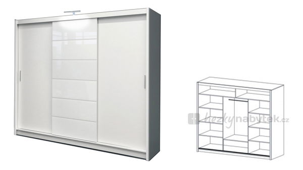 Rozměrná šatní skříň s věšákovou tyčí, umístěnou ve středu pod horní policí. Uvnitř jsou na pravé a levé straně umístěny hluboké poličky. Pod věšákovou tyčí se nacházejí 2 poličky. Skříň má posuvné dveře a uprostřed má od shora dolů umístěny bílé sklo. Jemné svislé tenké úchyty. Osvětlení skříně je v cene.