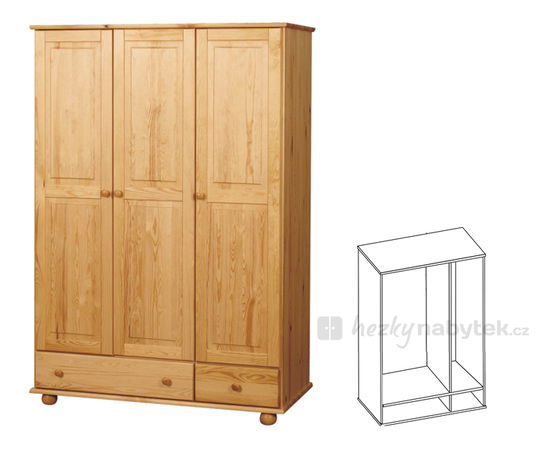 Velká třídveřová šatní skříň nabízí dostatek úložného prostoru pro Vaše věci. V dolní části je doplněna o tři zásuvky.