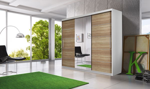 Šatní skříň Mebur 23 230 (bílá + dub sonoma + zrcadlo)
