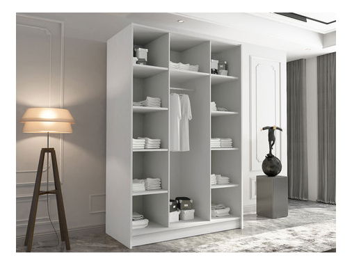 Moderní 3dveřová šatní skříň Merpata I je návrhem na zařízení obývacího pokoje, předsíně a rodinného šatníku. Přehledný vnitřek nábytku nabízí dostatek úložného prostoru. Připravili jsme poličky na oblečení poskládané do kostek a také tyč na zavěšení ramínek. Takový prostor předpokládá měnící se potřeby skladování v průběhu času. Šatní skříň Merpata I zaujme i dobrým designem. Rukojeti s dlouhými okraji dodávají minimalistickému tvaru charakter. V této verzi se nábytek stává ozdobou interiéru a chloubou hostitelů.