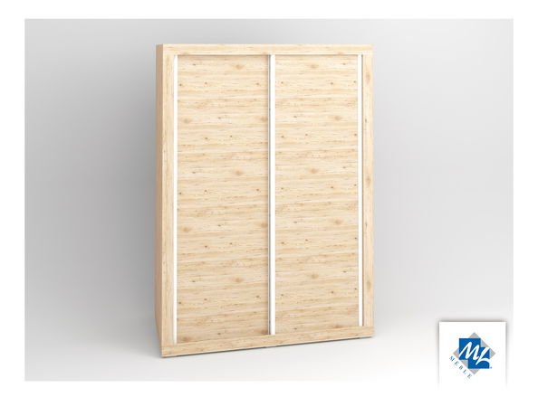 Šatní skříň s posuvnými dveřmi, kde v levé části se nacházejí čtyři poličky a v části pravé věšáková tyč.