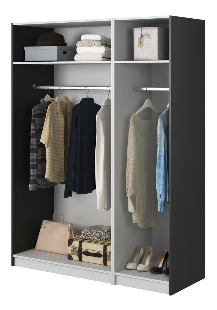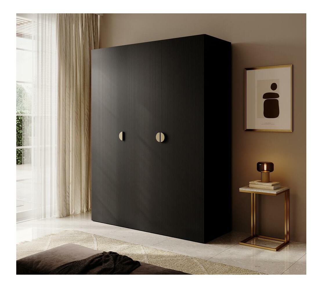 Sníte o elegantním uložení oblečení? Hledáte praktický a elegantní šatník? Představujeme šatní skříň - spojení stylu a praktičnosti pro váš prostor Třídveřová skříň je elegantním a stylovým řešením, které bude skvělou alternativou šatní skříně. Jeho minimalistický design se perfektně hodí do moderního i klasického interiéru. Celé tělo je vyrobeno z kvalitní laminované dřevotřísky, která zaručuje odolnost a snadné čištění. Čela šatníku mají jemné lamely, které mu dodávají jemnou texturu a zajímavý vizuální efekt. Přední strana má zlatou, půlkruhovou rukojeť z broušené oceli, která dodává rafinovaný vzhled a kontrastuje s matným tělem. Interiér šatníku byl navržen tak, aby se do něj vešly různé oděvy. Kolejnice vám umožní zavěsit oblečení, abyste jej udrželi v dobrém stavu, zatímco horní police vám umožní uložit méně často používané oblečení nebo doplňky. Kontejner se dvěma zásuvkami poskytuje další prostor pro uložení drobného příslušenství nebo spodního prádla, což umožňuje větší pořádek v šatníku. Sloupec s policemi umožňuje efektivně třídit oblečení a doplňky. Klasická barva dodává místnosti eleganci a styl a tlumené barvy dokonale ladí s různými dekorativními styly. Šatní skříň je tedy nejen funkčním prvkem interiéru, ale i estetickým akcentem, který dokáže vnést do prostoru nádech modernosti a třídy. , čela z MDF desky potažená černou PVC fólií, úchytky zlaté barvy z broušené oceli, 96,5 cm dlouhá lišta umístěná ve výšce 147 cm od základny, rozměry police: šířka 46 ,5 /96,5 cm / výška 30 cm / hloubka 55 cm, zásuvky umístěné na kulových vodítkách zabezpečujících volné a plynulé vysouvání, rozměry zásuvky: šířka 37 cm / výška 13 cm / hloubka 38 cm, možné změny konfigurace uvnitř skříně ve stadiu montáže.  ;