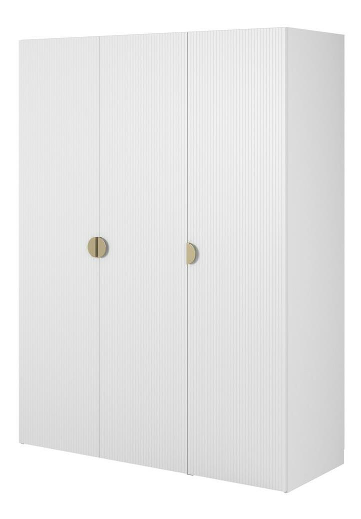 Sníte o elegantním uložení oblečení? Hledáte praktický a elegantní šatník? Představujeme šatní skříň - spojení stylu a praktičnosti pro váš prostor Třídveřová skříň je elegantním a stylovým řešením, které bude skvělou alternativou šatní skříně. Jeho minimalistický design se perfektně hodí do moderního i klasického interiéru. Celé tělo je vyrobeno z kvalitní laminované dřevotřísky, která zaručuje odolnost a snadné čištění. Čela šatníku mají jemné lamely, které mu dodávají jemnou texturu a zajímavý vizuální efekt. Přední strana má zlatou, půlkruhovou rukojeť z broušené oceli, která dodává rafinovaný vzhled a kontrastuje s matným tělem. Interiér šatníku byl navržen tak, aby se do něj vešly různé oděvy. Kolejnice vám umožní zavěsit oblečení, abyste jej udrželi v dobrém stavu, zatímco horní police vám umožní uložit méně často používané oblečení nebo doplňky. Klasická barva dodává místnosti eleganci a styl a tlumené barvy dokonale ladí s různými dekorativními styly. Šatní skříň je tedy nejen funkčním prvkem interiéru, ale i estetickým akcentem, který dokáže vnést do prostoru nádech modernosti a třídy. , čela z MDF desky potažená bílou PVC fólií, úchyty zlaté barvy z broušené oceli, lišta o délce 96,5 cm a 46,5 cm umístěná ve výšce 147 cm od základny, rozměry police: šířka 46,5/96,5 cm / výška 30 cm / hloubka 55 cm, možnost změny konfigurace uvnitř šatníku ve stádiu montáže.
