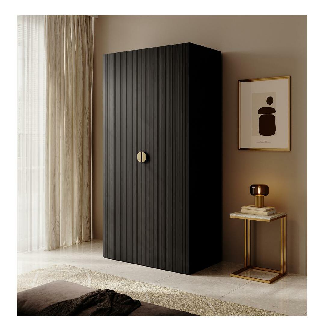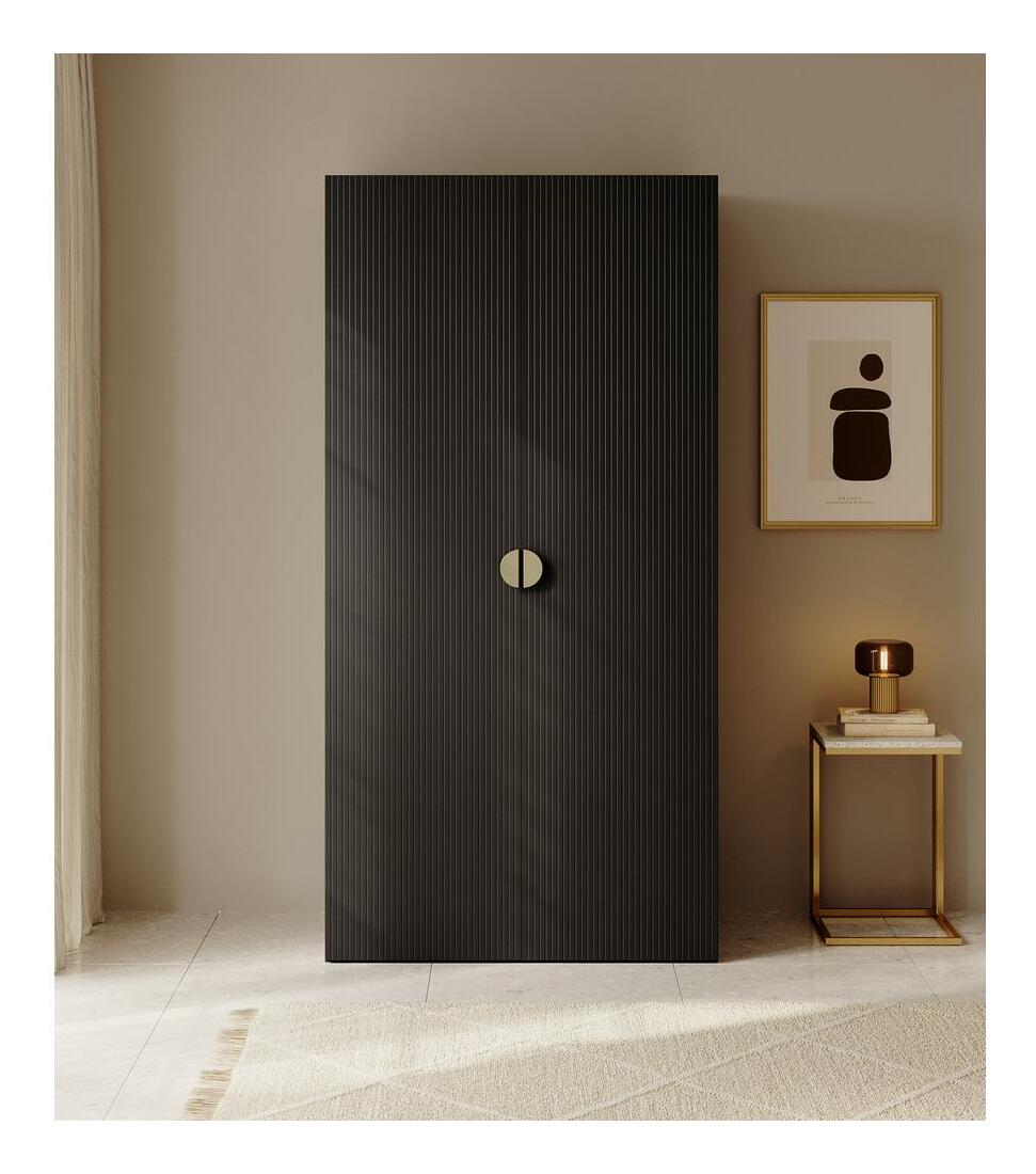ZobrazitSníte o elegantním uložení oblečení? Hledáte praktický a elegantní šatník? Představujeme šatní skříň - spojení stylu a praktičnosti pro váš prostor Dvoudveřová skříň je elegantním a stylovým řešením, které bude skvělou alternativou šatní skříně. Jeho minimalistický design se perfektně hodí do moderního i klasického interiéru. Celé tělo je vyrobeno z kvalitní laminované dřevotřísky, která zaručuje odolnost a snadné čištění. Čela šatníku mají jemné lamely, které mu dodávají jemnou texturu a zajímavý vizuální efekt. Přední strana má zlatou, půlkruhovou rukojeť z broušené oceli, která dodává rafinovaný vzhled a kontrastuje s matným tělem. Interiér šatníku byl navržen tak, aby se do něj vešly různé oděvy. Kolejnice vám umožní zavěsit oblečení, abyste jej udrželi v dobrém stavu, zatímco horní police vám umožní uložit méně často používané oblečení nebo doplňky. Kontejner se dvěma zásuvkami poskytuje další prostor pro uložení drobného příslušenství nebo spodního prádla, což umožňuje větší pořádek v šatníku. Sloupec s policemi umožňuje efektivně třídit oblečení a doplňky. Klasická barva dodává místnosti eleganci a styl a tlumené barvy dokonale ladí s různými dekorativními styly. Šatní skříň je tedy nejen funkčním prvkem interiéru, ale i estetickým akcentem, který dokáže vnést do prostoru nádech modernosti a třídy. , čela z MDF desky potažená černou PVC fólií, úchytky zlaté barvy z broušené oceli, 46,5 cm dlouhá lišta umístěná ve výšce 147 cm od základny, rozměry police: šířka 46 ,5 cm / výška 30 cm / hloubka 55 cm, zásuvky umístěné na kulových vodítkách zajišťujících volné a plynulé vysouvání, rozměry zásuvky: šířka 37 cm / výška 13 cm / hloubka 38 cm, možnost změny konfigurace uvnitř skříně při montáži.