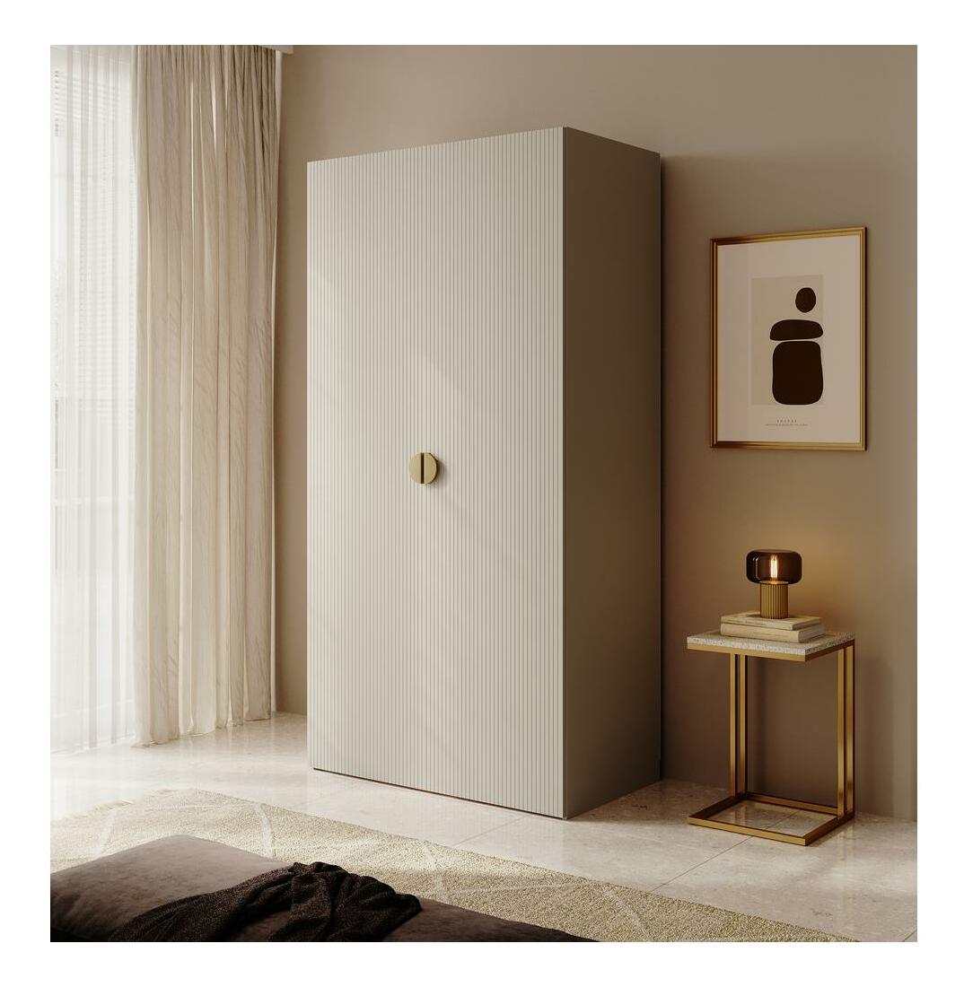 ZobrazitSníte o elegantním uložení oblečení? Hledáte praktický a elegantní šatník? Představujeme šatní skříň - spojení stylu a praktičnosti pro váš prostor Dvoudveřová skříň je elegantním a stylovým řešením, které bude skvělou alternativou šatní skříně. Jeho minimalistický design se perfektně hodí do moderního i klasického interiéru. Celé tělo je vyrobeno z kvalitní laminované dřevotřísky, která zaručuje odolnost a snadné čištění. Čela šatníku mají jemné lamely, které mu dodávají jemnou texturu a zajímavý vizuální efekt. Přední strana má zlatou, půlkruhovou rukojeť z broušené oceli, která dodává rafinovaný vzhled a kontrastuje s matným tělem. Interiér šatníku byl navržen tak, aby se do něj vešly různé oděvy. Kolejnice vám umožní zavěsit oblečení, abyste jej udrželi v dobrém stavu, zatímco horní police vám umožní uložit méně často používané oblečení nebo doplňky. Kontejner se dvěma zásuvkami poskytuje další prostor pro uložení drobného příslušenství nebo spodního prádla, což umožňuje větší pořádek v šatníku. Sloupec s policemi umožňuje efektivně třídit oblečení a doplňky. Klasická barva dodává místnosti eleganci a styl a tlumené barvy dokonale ladí s různými dekorativními styly. Šatní skříň je nejen funkčním prvkem interiéru, ale také estetickým akcentem, který dokáže vnést do prostoru nádech modernosti a třídy. Součástí sestavy jsou dvě úchytky - zlatá a černá, takže se můžete rozhodnout, která se více hodí do vašeho interiéru. Kličku můžete vyměnit i při změně vnitřního uspořádání bez nutnosti výměny nábytku Detaily produktu: korpus z laminované dřevotřískové desky o tloušťce 16 mm v barvě Cashmere 5981 BS Kronospan, která je odolná vůči vlhkosti, teplotě a poškrábání, čela. z MDF desky potažené šedo-béži PVC fólií, zlaté a černé úchyty z broušené oceli, 46,5 cm dlouhá lišta umístěná ve výšce 147 cm od základny, rozměry police: šířka 46,5 cm / výška 30 cm / hloubka 55 cm , zásuvky umístěno na kulových vodítkách zajišťujících volné a plynulé vysouvání, rozměry zásuvky: šířka 37 cm / výška 13 cm / hloubka 38 cm, možnost změny konfigurace uvnitř skříně ve stadiu montáže.