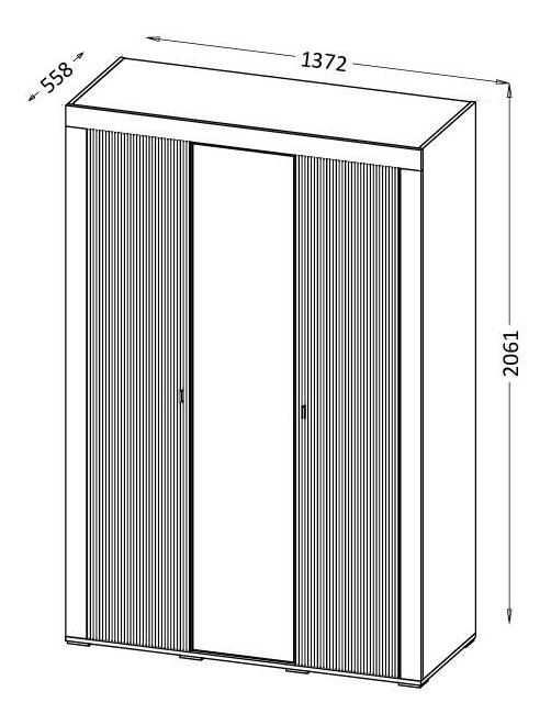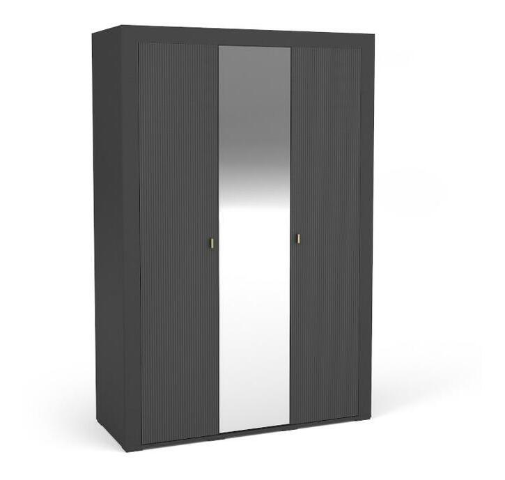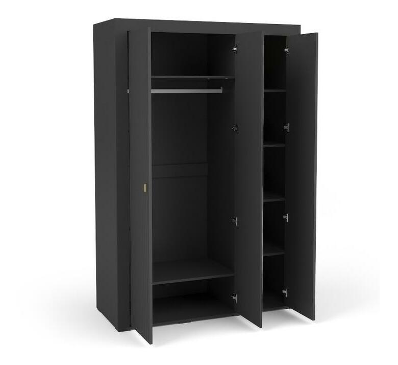 Šatní skříň Mossana MO1 (černá) o výšce 193,6 cm a hloubce 55,8 cm je klasickou volbou pro každý šatník nebo předsíň. Tato skříň je ideální pro zavěšení kabátů a jiných věcí. Skříň je dostupná v několika barevných provedeních. Korpus skříně, jakož i její přední část jsou vyrobeny z laminátu s černou povrchovou úpravou. Úchytky jsou ve tvaru obdélníku, zlaté barvy a připevněny pomocí šroubů. Skříň je vybavena zrcadlem a obsahuje jednu tyč na zavěšení šatstva. Tyč je umístěna v levé části skříně, přičemž tento prostor je ohraničen dvěma poličkami, jednou v dolní a jednou v horní části skříně. Pravá část skříně obsahuje 5 samostatných úzkých polic ideálních pro uskladnění skládaného šatstva nebo doplňků.