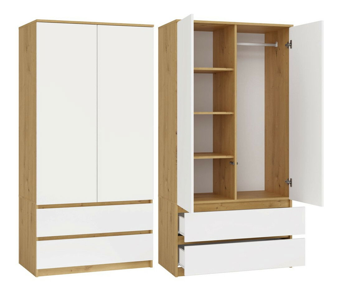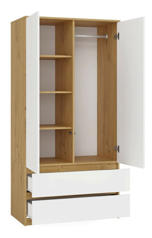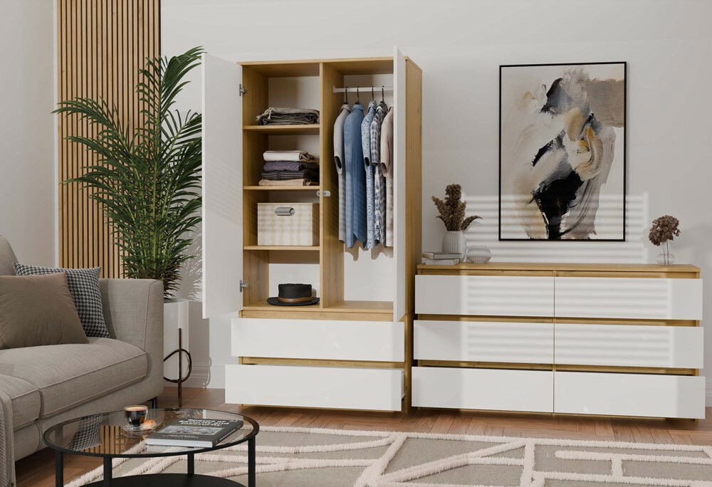 ZobrazitŠatní skříň Musecalo 1 je ideálním řešením pro moderní interiéry, kde se elegance potýká s funkčností. S její kombinací teplého odstínu dubu artisan a bílých, bezúchytových front, skříň nejenže poskytuje dostatek úložného prostoru s pěti policemi, tyčí na oblečení a dvěma prostornými zásuvkami, ale také vkusně doplňuje každý prostor, ať už jde o ložnici, šatník nebo domácí kanceláře. Systém TIP-ON zajišťuje snadné otevírání a zavírání, čímž zvyšuje komfort používání. Tento kus nábytku je skutečným přínosem pro každou domácnost.