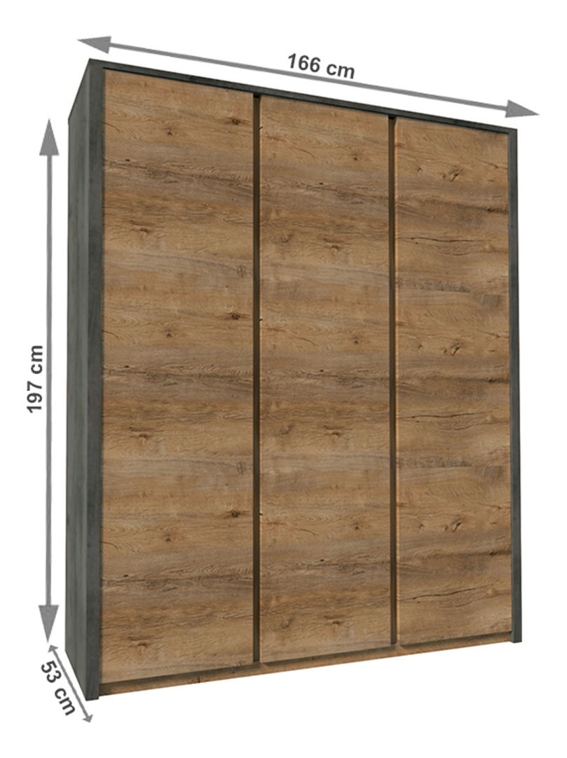 Šatní skříň Modestus S3D (dub lefkas tmavý + smooth šedý) o výšce 197 cm a hloubce 53 cm nabízí přehledné uspořádání vašich věcí. Skříň má troje dveře - pravá a levá část jsou určeny k zavěšení oděvů na ramínkovou tyč a jednu poličku, střední část má čtyři poličky. Elegantní a moderní design skříně bez úchytek okouzlí váš smysl pro estetiku. Materiál je z DTD laminátu s ABS hranami, což zaručuje odolnost skříně. Skříň je dodávána v demontu, ale díky jednoduchému návodu k montáži si ji můžete snadno sundat sami doma. Rozměry jsou 166x53x197 cm a tloušťka materiálu je 15 mm. Tato šatní skříň je ideální pro ty, kteří hledají praktické a moderní řešení pro svůj domov.