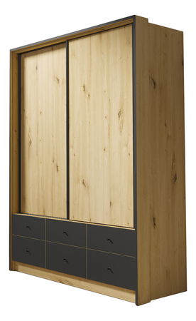 Tato samostatně stojící šatní skříň Narcius se dvěma posuvnými dveřmi je ideálním kusem nábytku do vaší ložnice. Lehce do ní ukryjete množství šatstva, protože má velmi dobře členěný vnitřek. Uvnitř naleznete dvě šatní tyče pro zavěšení halenek a šatů. V horní části jsou dvě police a ve spodní části je až šest praktických zásuvek. Skříň je vyrobena z dřevotřísky a je ošetřena ochrannými ABS hranami. Zajímavé barevné provedení vás jistě zaujme.