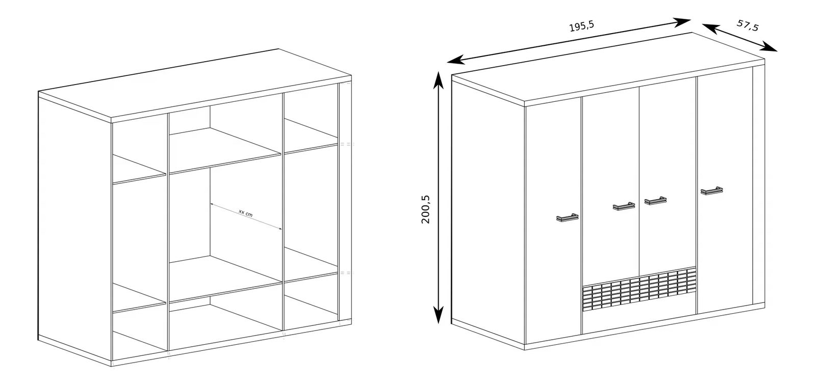 ZobrazitJednoduchá velká čtyřdveřová šatní skříň, která poslouží pro uložení mnoha věcí. Kovové úchyty a pevná konstrukce dělají skříň odolnou a stabilní. Skvělou a jedinečnou vlastností, která podtrhne jemnost nábytku, jsou také panty s tichým zavíráním. Šatní skříň má pět prostorných polic, na které můžete umístit množství oblečení, doplňků nebo dokumentů. Ve spodní části jsou dvě velké a užitečné zásuvky, do kterých se vejde spousta věcí. Je zde možnost přídavných polic, díky kterým budete mít více místa na věci, které vyžadují rovný povrch.