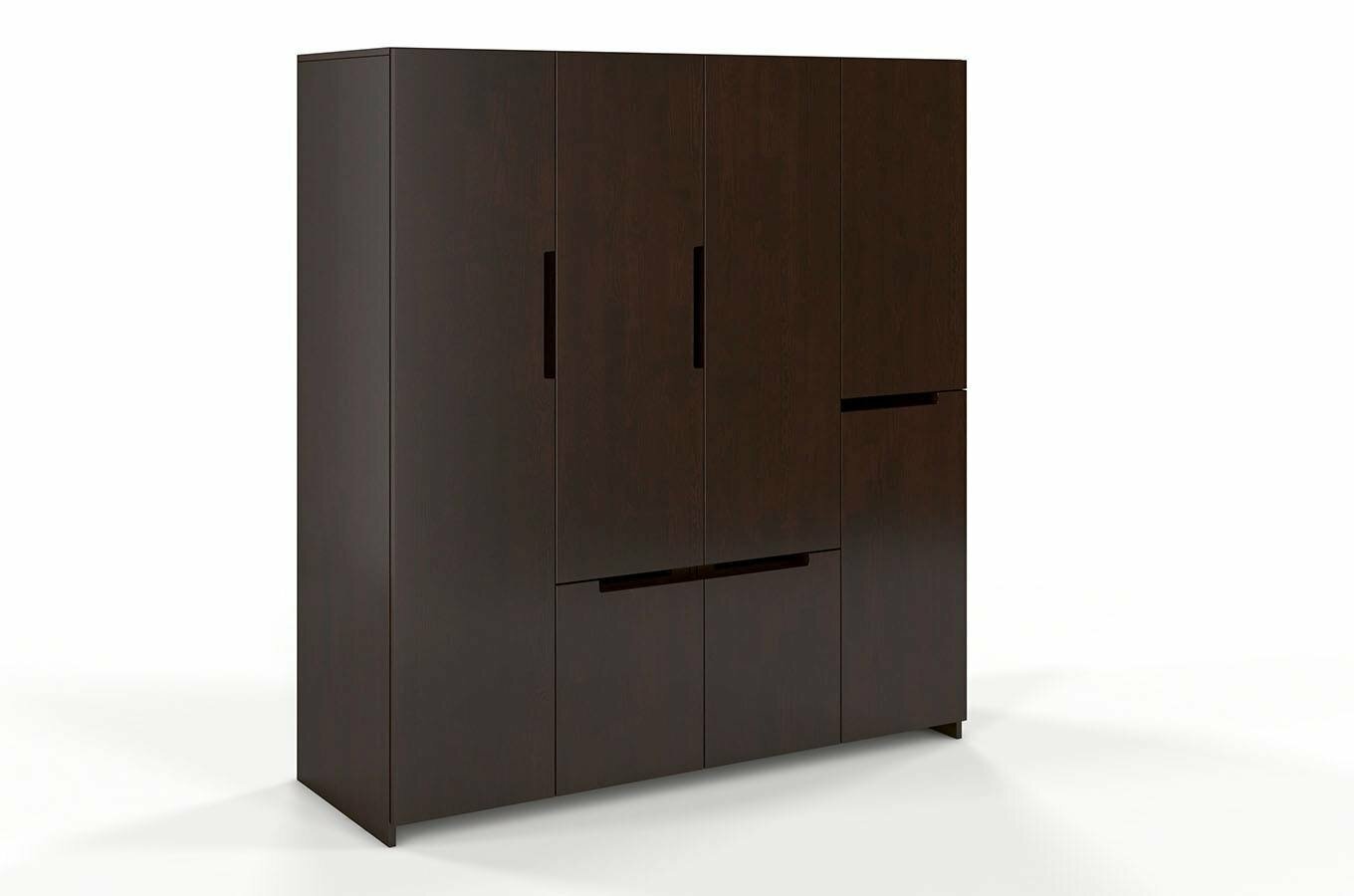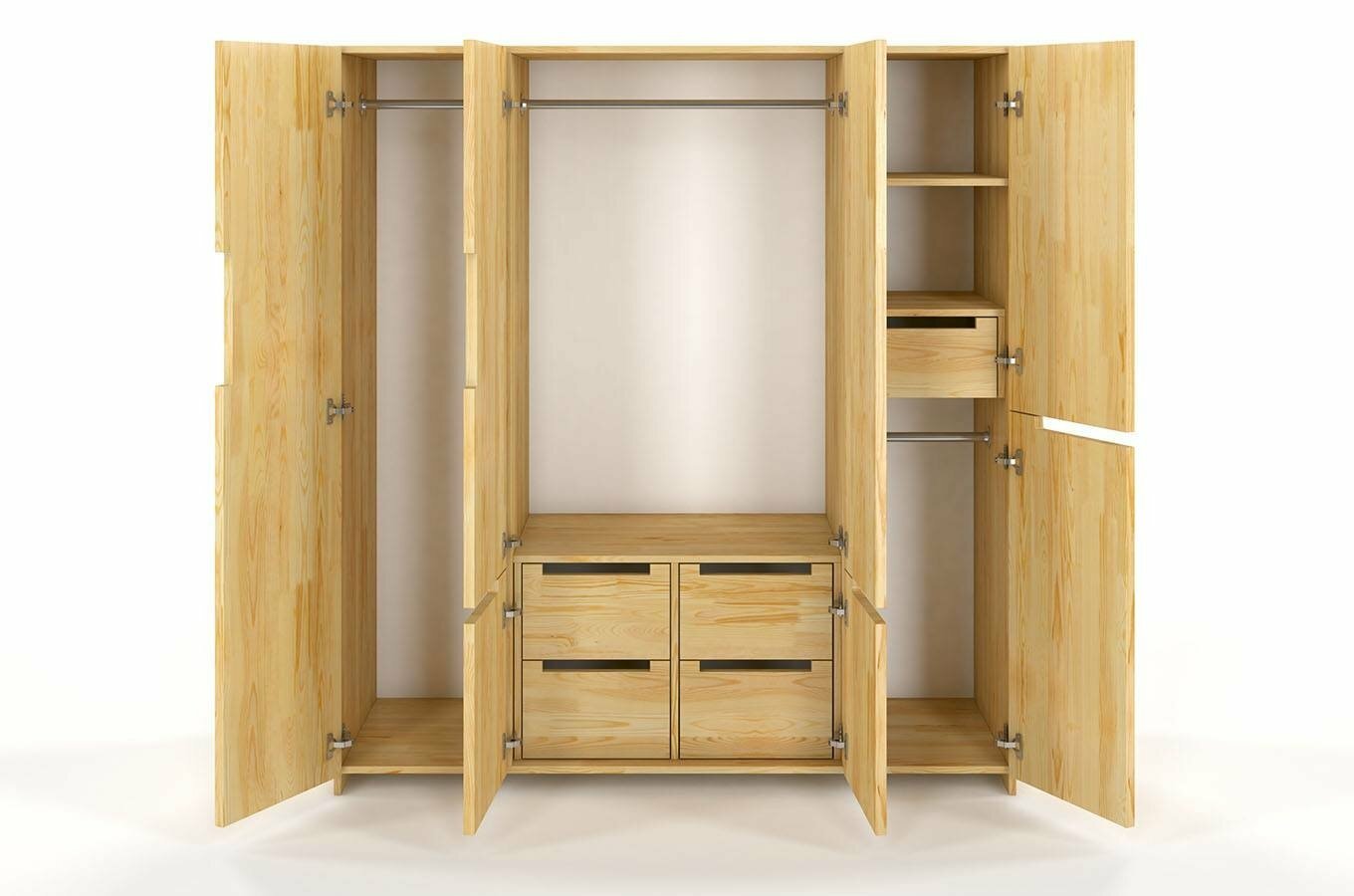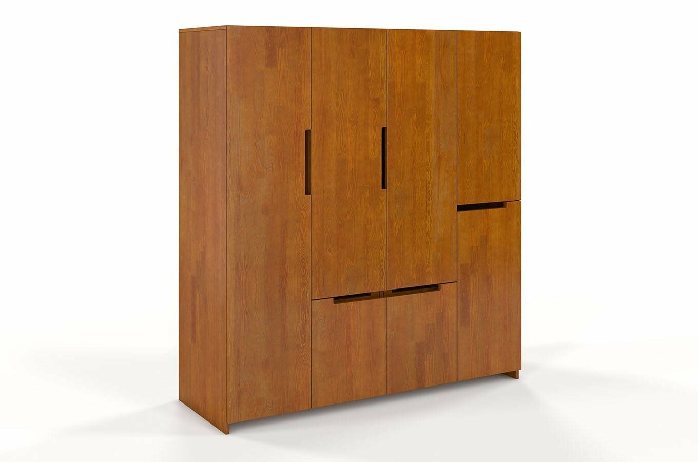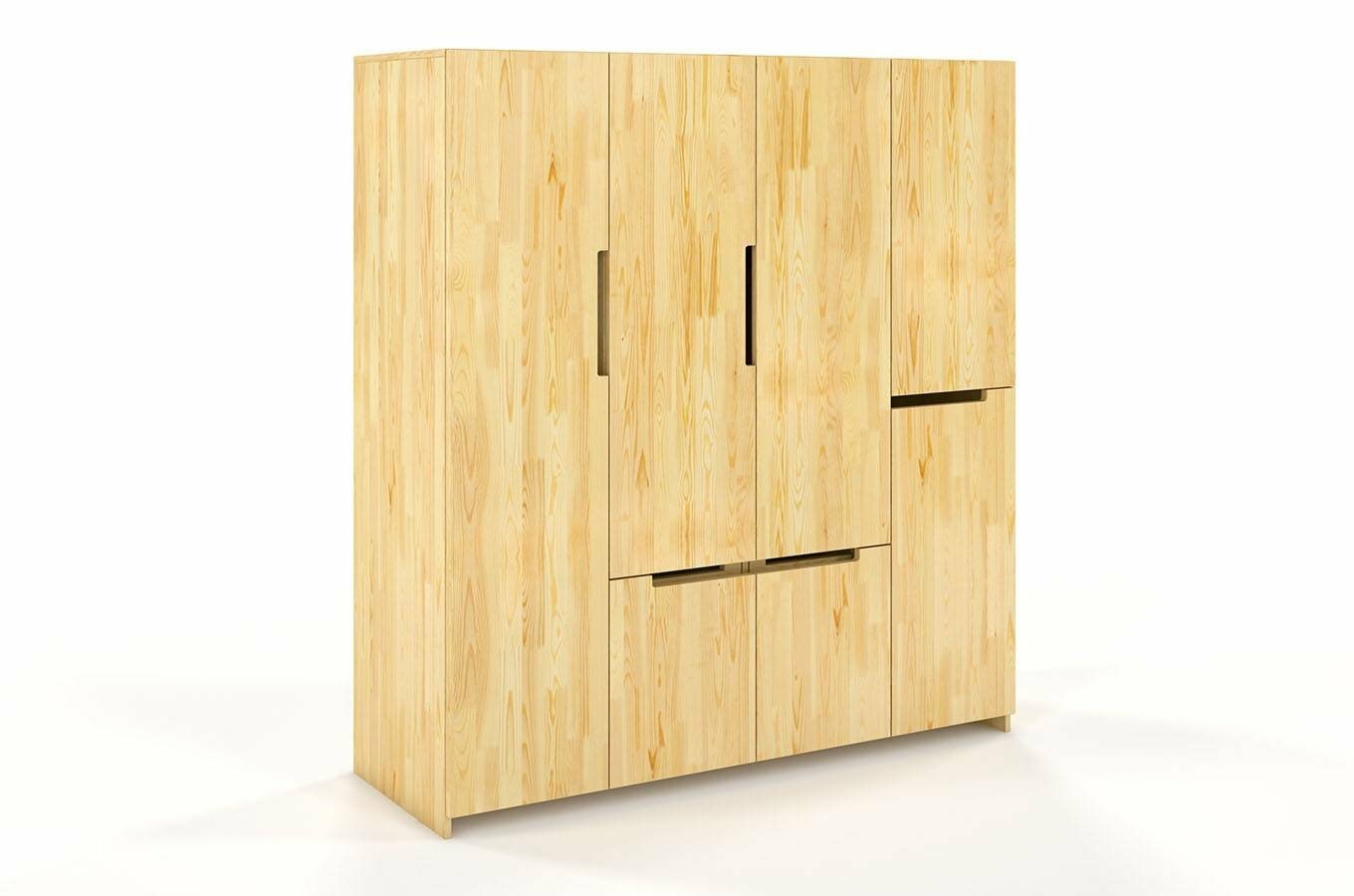 Šatní skříň Naturlig Larsos 4D5S (borovice) o výšce 180 cm a hloubce 60 cm je ideální volbou pro každého, kdo upřednostňuje pořádek a přehledně uložené věci. Tato šatní skříň z borovicového dřeva má moderní design a hodí se nejen do ložnice, ale také do předsíně. Její vnitřní dělení, které obsahuje 3 šatní tyče, 2 poličky, 5 zásuvek a prostor pro větší předměty, umožňuje udržovat přehlednost v uložených věcech. Střední část skříně tvoří šatní tyč na kabáty a dlouhé oděvy, ve spodní části jsou 4 zásuvky vhodné pro prádlo nebo doplňky. V pravé části jsou 2 police, zásuvka a menší šatní tyč. Za levými dveřmi najdete prostor pro větší předměty - žehlící prkno, mop a podobně. Konstrukce z borovicového dřeva zajišťuje dlouhou životnost a odolnost vůči deformacím způsobeným vlhkostí. Každý kus je ošetřen vrstvou ochranného laku, který chrání nábytek před škrábáním a oděrem. Zásuvky mají automatický systém dovírání. Rozměry šatní skříně jsou šířka 170 cm, výška 180 cm a hloubka 60 cm. Při nákupu tohoto produktu je požadována záloha ve výši 50% z ceny s DPH předem. Produkt je natřen moderním vysoce kvalitním lakem na bázi vody, který poskytuje ochranu proti oděrům, poškrábání a čistícím prostředkům běžně používaným v domácnosti.