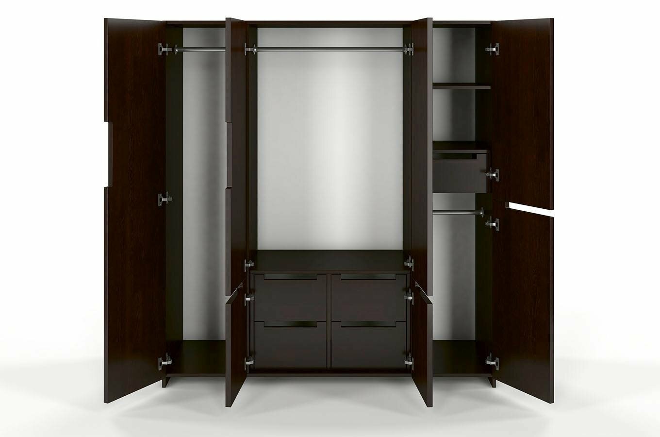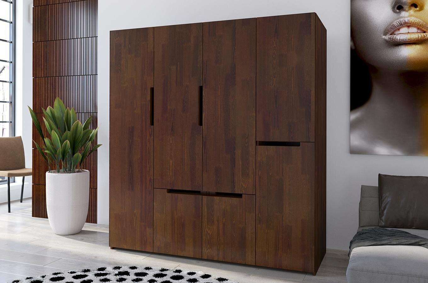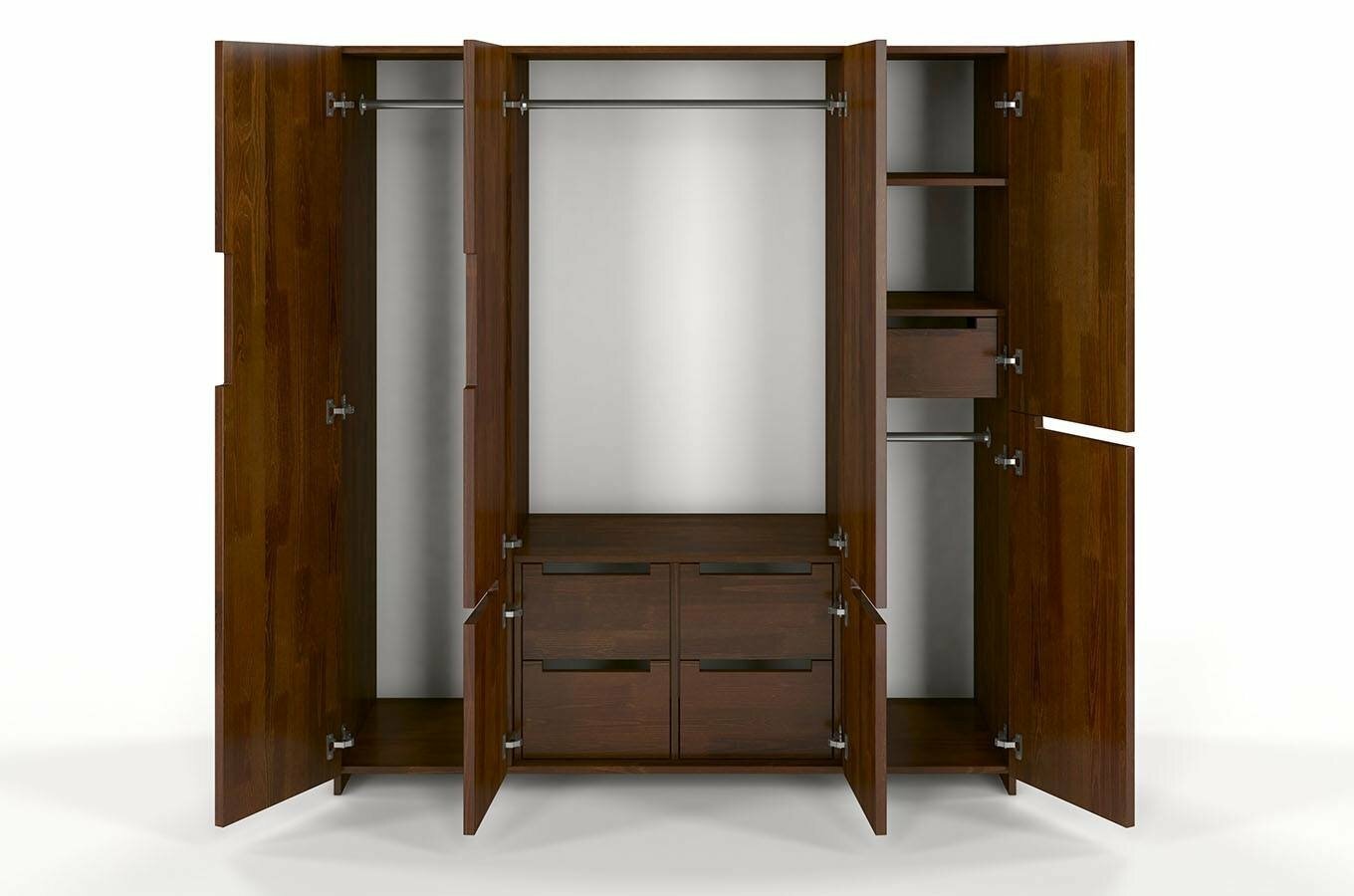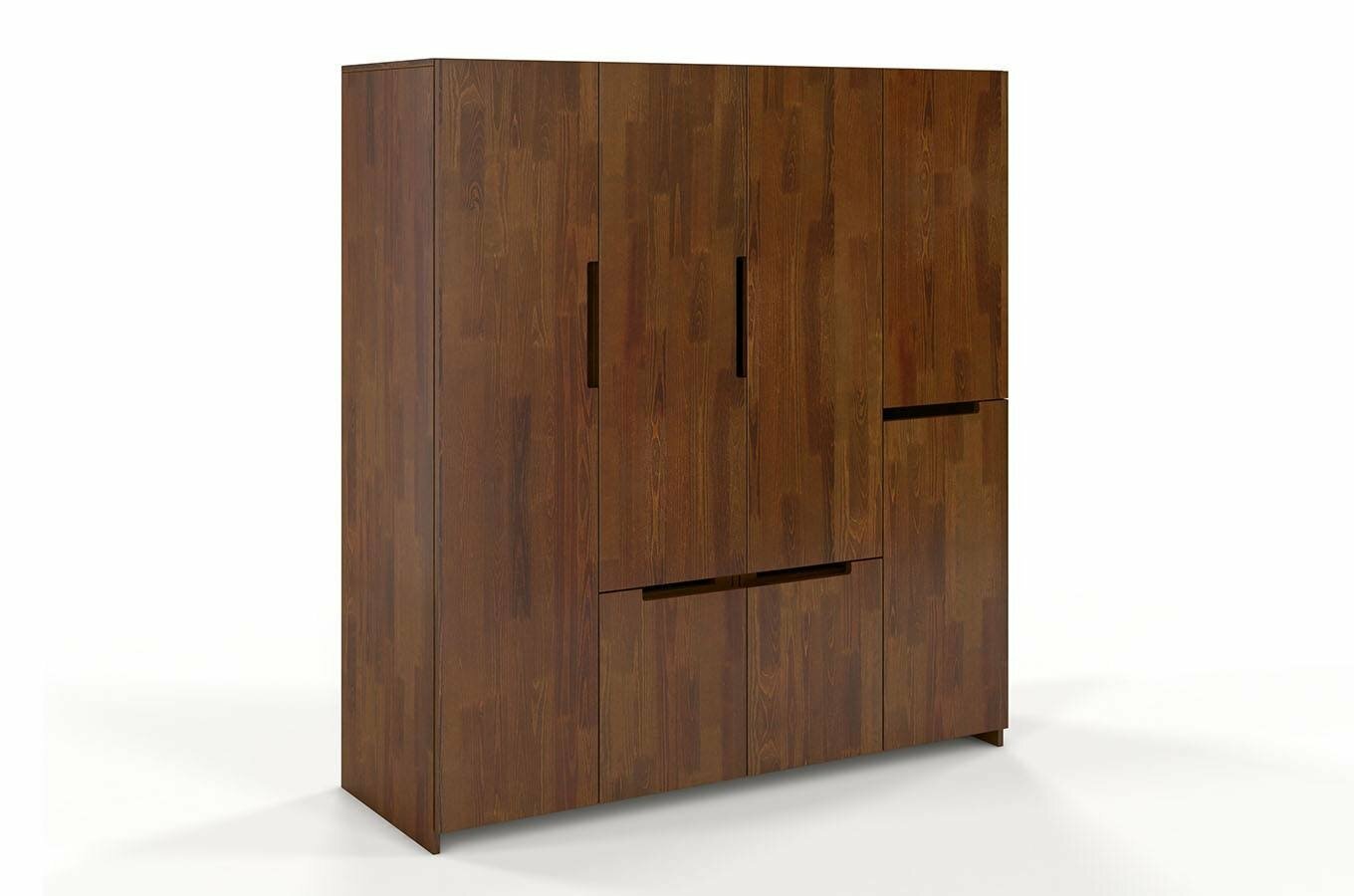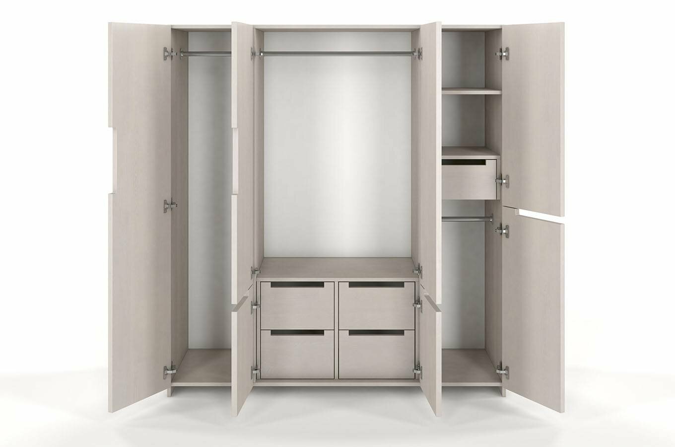 Šatní skříň Naturlig Larsos 4D5S (borovice) o výšce 180 cm a hloubce 60 cm je ideální volbou pro každého, kdo upřednostňuje pořádek a přehledně uložené věci. Tato šatní skříň z borovicového dřeva má moderní design a hodí se nejen do ložnice, ale také do předsíně. Její vnitřní dělení, které obsahuje 3 šatní tyče, 2 poličky, 5 zásuvek a prostor pro větší předměty, umožňuje udržovat přehlednost v uložených věcech. Střední část skříně tvoří šatní tyč na kabáty a dlouhé oděvy, ve spodní části jsou 4 zásuvky vhodné pro prádlo nebo doplňky. V pravé části jsou 2 police, zásuvka a menší šatní tyč. Za levými dveřmi najdete prostor pro větší předměty - žehlící prkno, mop a podobně. Konstrukce z borovicového dřeva zajišťuje dlouhou životnost a odolnost vůči deformacím způsobeným vlhkostí. Každý kus je ošetřen vrstvou ochranného laku, který chrání nábytek před škrábáním a oděrem. Zásuvky mají automatický systém dovírání. Rozměry šatní skříně jsou šířka 170 cm, výška 180 cm a hloubka 60 cm. Při nákupu tohoto produktu je požadována záloha ve výši 50% z ceny s DPH předem. Produkt je natřen moderním vysoce kvalitním lakem na bázi vody, který poskytuje ochranu proti oděrům, poškrábání a čistícím prostředkům běžně používaným v domácnosti.