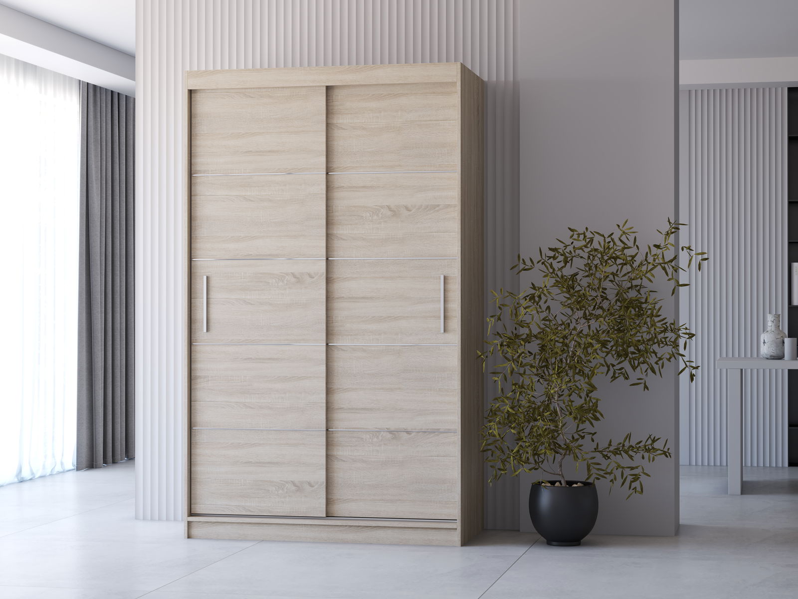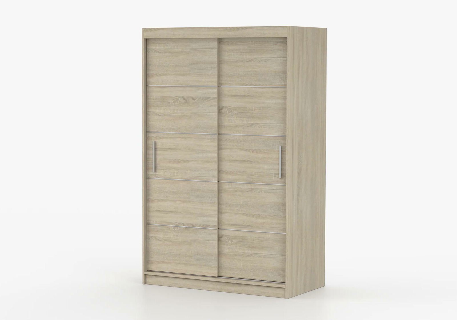 Šatní skříň je praktický a elegantní kus nábytku, ideální pro uspořádání vašeho oblečení. Tato skříň je vyrobena z 16 mm silné dřevotřísky, která je použita jak pro vnější, tak i vnitřní materiál. Hrany skříně jsou dokončeny s 0,5 mm silnými ABS hranami, zajišťujícími její odolnost a estetický vzhled. Úchyty skříně jsou vyrobeny z PVC v obdélníkovém tvaru a mají stříbrnou barvu, což dodává skříni moderní vzhled. Jsou připevněny pomocí šroubů, což zajišťuje jejich pevnost a stabilitu. Skříň není vybavena zrcadlem, což umožňuje její využití v různých typech místností. Uvnitř skříně se nachází jedna tyč pro zavěšení oděvů, umístěná podélně na pravé straně. Skříň také nabízí dostatečný úložný prostor s celkem pěti poličkami, z nichž čtyři jsou umístěny na levé straně a jedna na pravé. Tento rozložení poliček poskytuje flexibilní možnosti uspořádání oděvů a jiných předmětů, což činí tuto šatní skříň nejen funkční, ale také stylovou součástí vašeho domova.