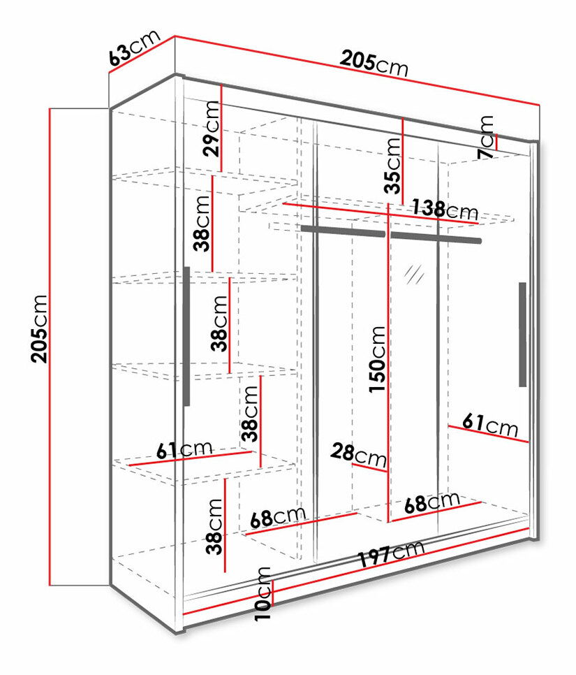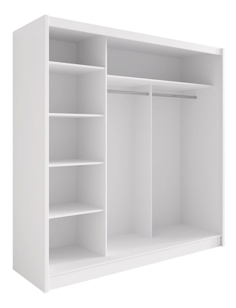 Jednoduché, prostorné a elegantní. Toto jsou vlastnosti, díky kterým se šatní skříň Noelle odlišuje od ostatních skříní. Tento model je vybaven inovativním systémem posuvných dveří, který funguje skvěle v úzkých nebo malých místnostech. Na jedné z front je umístěno prostorné zrcadlo, které vizuálně zvětšuje prostor a dodává mu zajímavý charakter. Uvnitř šatníku naleznete hluboké police a stojany na ramínka, které umožňují snadné a bezproblémové oddělení oděvů. Šatník je vyroben z laminované dřevotřísky a MDF v módních barvách.