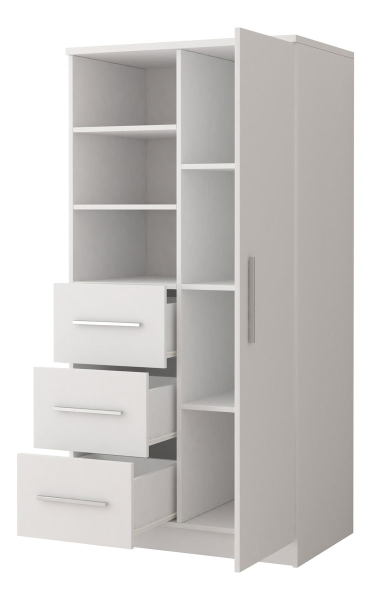 Minimalistická šatní skříň, vyrobená z 16 mm silné dřevotřísky pro vnitřní i vnější části, poskytuje moderní a funkční úložný prostor. ABS hrany o tloušťce 0,5 mm přidávají k její odolnosti a estetice. Skříň má stříbrné, plastové úchyty, které jsou praktické a zároveň zachovávají její jednoduchý vzhled. Bez nožiček, skříň stojí přímo na podlaze, což zajišťuje stabilitu a usnadňuje čištění kolem ní. Se třemi zásuvkami a jedněmi dveřmi nabízí dostatek prostoru pro oblečení a další předměty. Tento kus nábytku je ideální pro ty, kdo preferují čisté linie a minimalismus v jejich domovech.