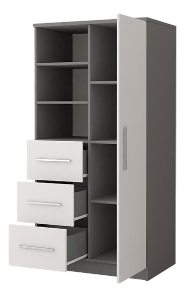 Minimalistická šatní skříň, vyrobená z 16 mm silné dřevotřísky pro vnitřní i vnější části, poskytuje moderní a funkční úložný prostor. ABS hrany o tloušťce 0,5 mm přidávají k její odolnosti a estetice. Skříň má stříbrné, plastové úchyty, které jsou praktické a zároveň zachovávají její jednoduchý vzhled. Bez nožiček, skříň stojí přímo na podlaze, což zajišťuje stabilitu a usnadňuje čištění kolem ní. Se třemi zásuvkami a jedněmi dveřmi nabízí dostatek prostoru pro oblečení a další předměty. Tento kus nábytku je ideální pro ty, kdo preferují čisté linie a minimalismus v jejich domovech.