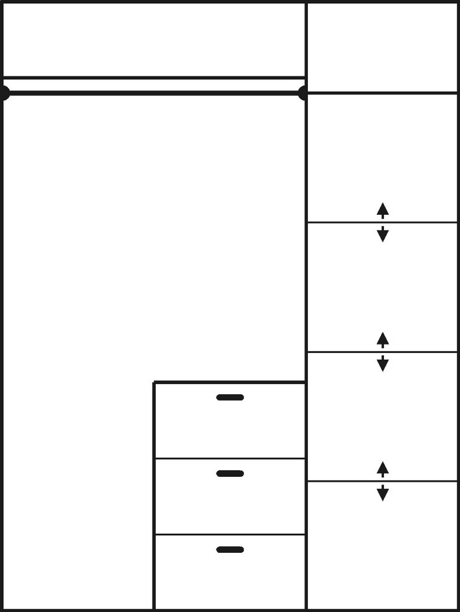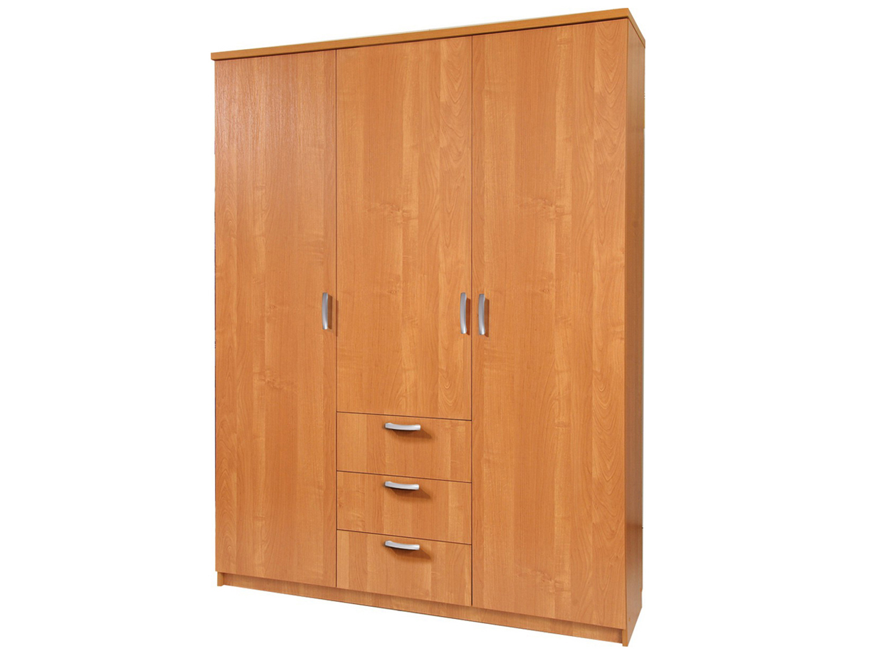 Trojdílná šatní skříň s dveřmi na pantech. Pravý díl a střední díl je vybaven věšákovou tyčí umístěnou pod horní deskou a pod ní vpravo dole se nacházejí 3 zásuvky. Pravý díl je vybaven policemi. Šedé oválné úchyty. Provedení olše a buk.