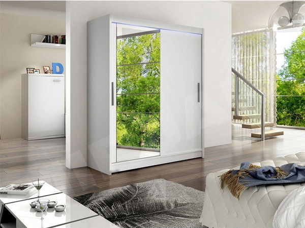 Šatní skříň, která je vyrobena z laminované dřevotřísky v tloušťce 16mm. Na dveřích skříně je zrcadlo, které opticky zvětší prostor. Má posuvné dveře na hliníkových vodicích lištách.