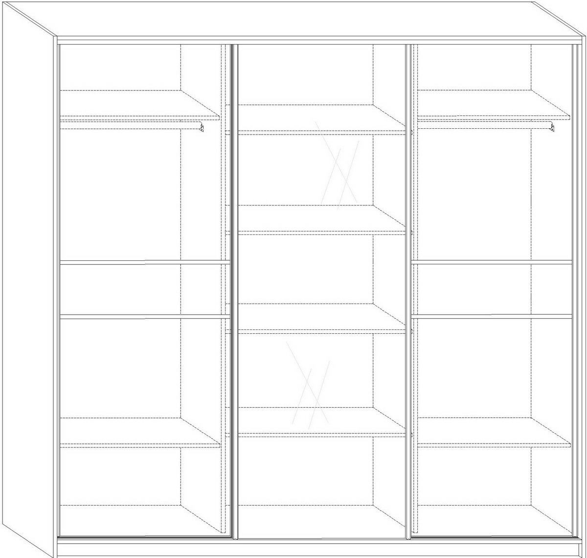 Elegantní šatní skříň s dostatkem úložného prostoru. Skříň má 3 posuvné dveře. Uvnitř se na levé i pravé straně nachází věšáková tyč a ta je umiestenená pod poličkou. Na spodku pravého a levého dílu se nachází jedna polička. Ve středu vnitřku skříně jsou umístěny 4 poličky. Provedení: korpus je dub sonoma světlá a pásy a čtverec na dveřích je v provedení dub sonoma tmavá. Celé střední dveře jsou zvenku zakryté zrcadlem.