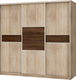 Elegantní šatní skříň s dostatkem úložného prostoru. Skříň má 3 posuvné dveře. Uvnitř se v levé a střední části nachází pod poličkou věšáková tyč. Ve středu jsou věšákové tyče dvě, jedna uprostřed a jedna pod horní poličkou. Na spodku levého dílu se nachází jedna polička. Na pravé straně vnitřku skříně jsou umístěny 4 poličky. Provedení: korpus je dub sonoma světlá a pásy a čtverec na dveřích je v provedení dub sonoma tmavá.