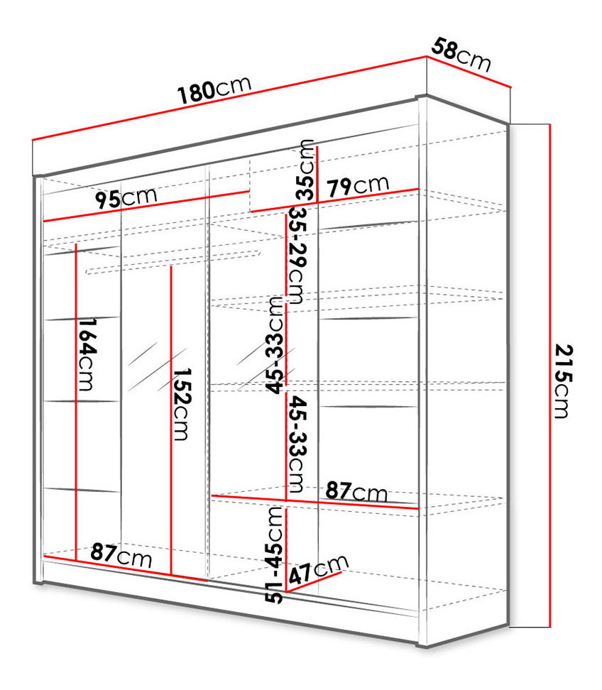 ZobrazitPosuvná skříň je ideální volbou pro ty, kdo hledají pohodlí a styl. Potřebujete velkou šatní skříň, která bude nabízet police a tyč pro ramínka? Náš návrh je posuvná skříň Bar V! Šířka šatníku je 180 cm a výška 215 cm. Příčky a police jsou vyrobeny ze stejné desky jako tělo, díky čemuž jsou odolné a stabilní. Posuvné dveře pracují lehce a jejich otevírání usnadňuje rukojeť ve formě hliníkového pruhu, který vede podél dveří. Rukojeti dodávají šatníku moderní vzhled a zabraňují jejímu ohnutí. Přední část skříně je kombinací velkého zrcadla, matné povrchové úpravy a ozdobných lamel. Kromě toho může být šatník osvětlen LED diodami. Rozměry: šířka: 180 cm, výška: 215 cm, hloubka: 58 cm Provedení: korpus a fronta: laminovaná deska o tloušťce 16 mm, příčky a police: 16 mm laminovaná deska, všechny prvky v matné desce, dýha z PVC, systém posuvných dveří Sevroll, kliky používané v posuvných dveřích zdůrazňují jejich moderní styl, zlepšují jejich funkčnost a brání v ohýbání dveří, RGB LED osvětlení jako doplňková možnost za příplatek (15 variabilních barev + dálkové ovládání) Záruka: 24 měsíců