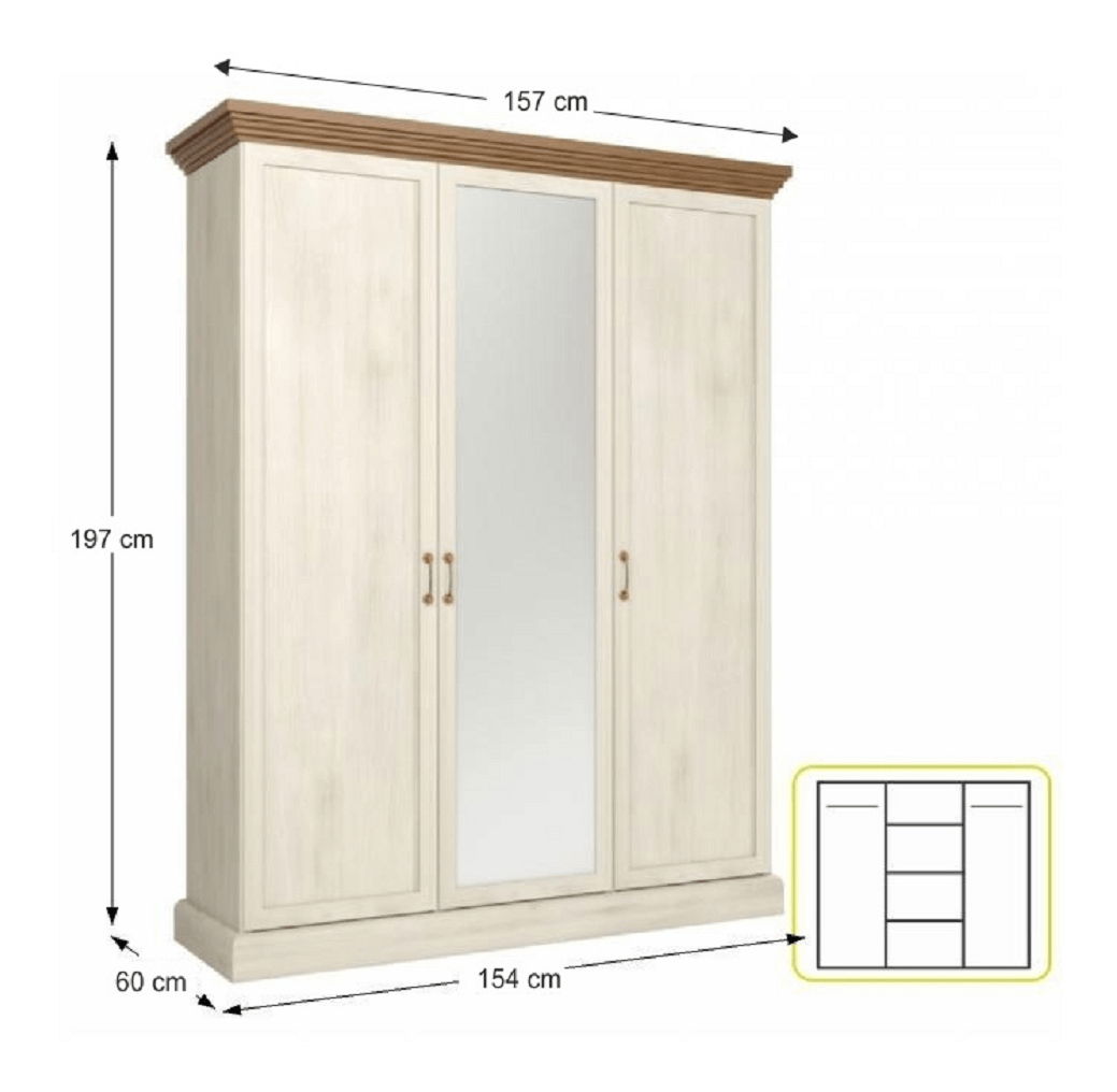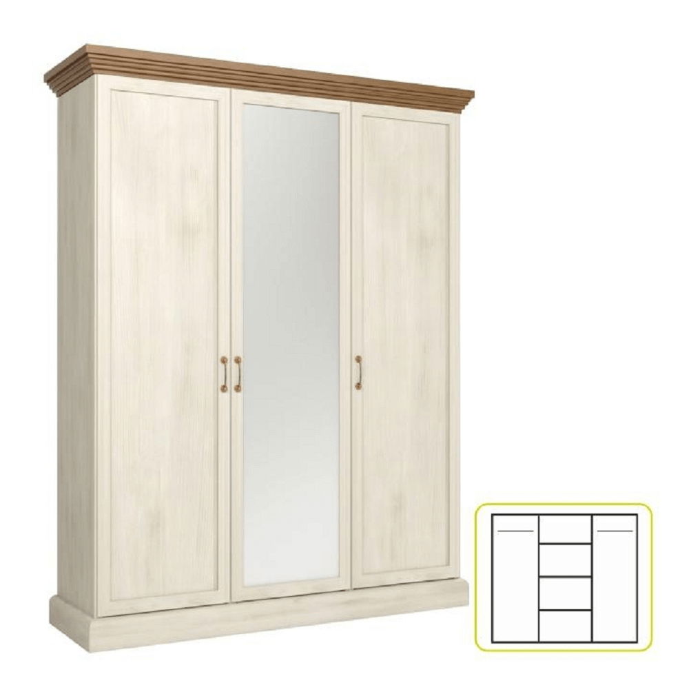 Prostorná a elegantní věšáková skříň Regnar s policí. Uprostřed se nacházejí dvířka se zrcadlem. Svěží bílé provedení a anglický styl skříně zkrášlí vaše obývací pokoje, ložnice nebo předsíně. Barevné provedení skříně je bílá sosna nordická v kombinaci s dubem divokým.