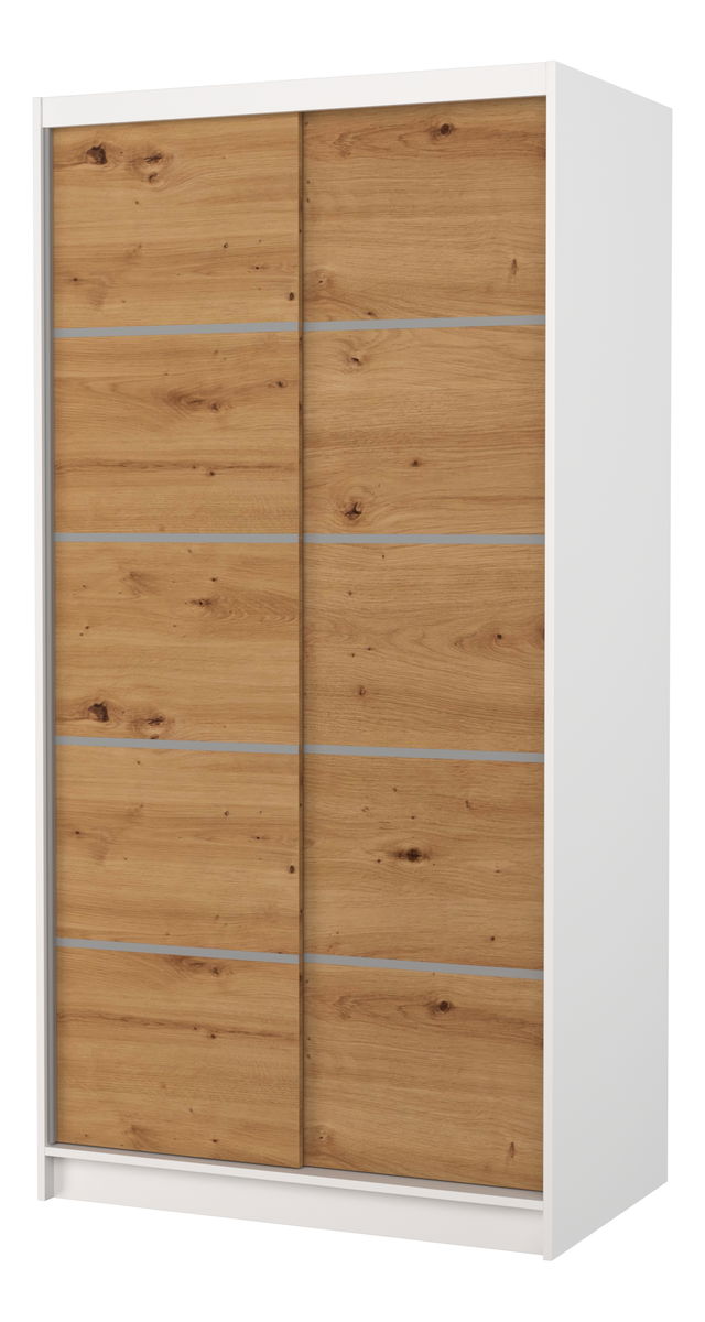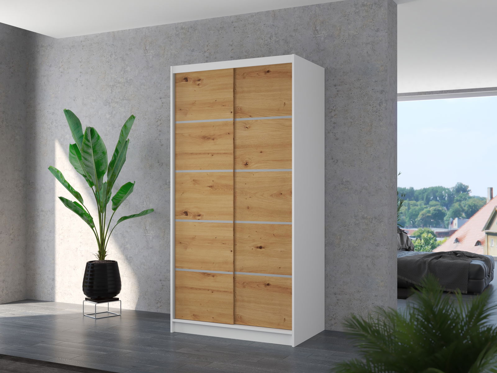 ZobrazitŠatní skříň Remea v bílém a dubovém provedení o výšce 200 cm, šířce 100 cm a hloubce 58 cm je ideální volbou pro každého, kdo hledá praktické a zároveň stylové úložné řešení. Skříň nabízí dostatek prostoru pro uskladnění vašich obleků, košil, bot a dalších věcí, přičemž její moderní design a kombinace bílých a dubových prvků skvěle zapadne do každého interiéru. Provedena je z kvalitních a odolných materiálů, což zaručuje její dlouhou životnost a spokojenost s nákupem.