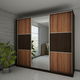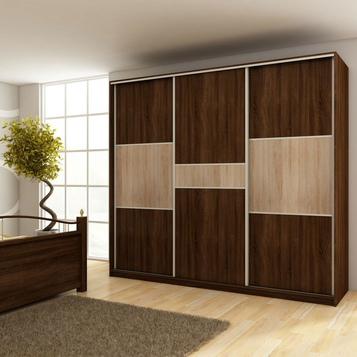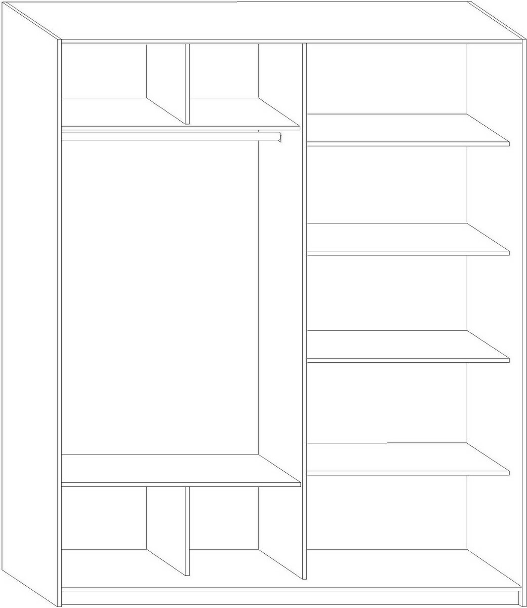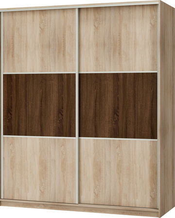 Elegantní šatní skříň s dostatkem úložného prostoru. Skříň má posuvné dveře a uvnitř se na levé straně nachází věšáková tyč, která je na umístěna pod horní poličkou. Na spodku levé části skříně se nachází jedna polička. Horní a dolní polička (levá strana) je předělena příčnou (svislou) deskou. Na pravé straně jsou umístěny 4 poličky. Provedení: korpus je dub sonoma světlá a vodorovný pás na dveřích je pás v provedení dub sonoma tmavá.