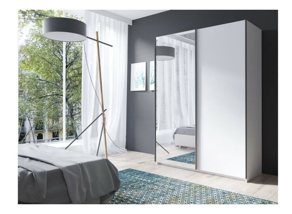 Šatní skříň Richmond působí moderně a zkrášlí prostor Vaší ložnice. Na dveřích skříně je velký zrcadlový panel. V levé části se nachází věšáková tyč a v pravé části police.
